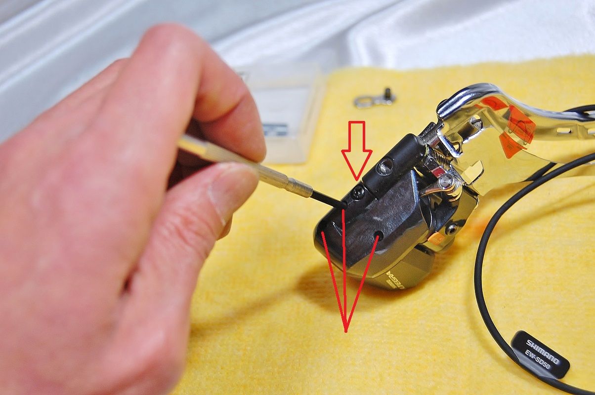 ケージの位置と六角レンチが書けてあるアジャストボルトの頭に注目。それでは緩めて行きます。