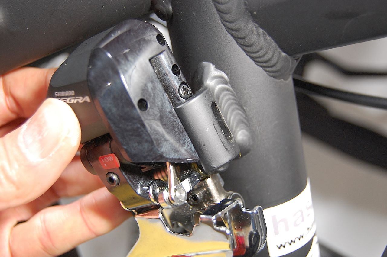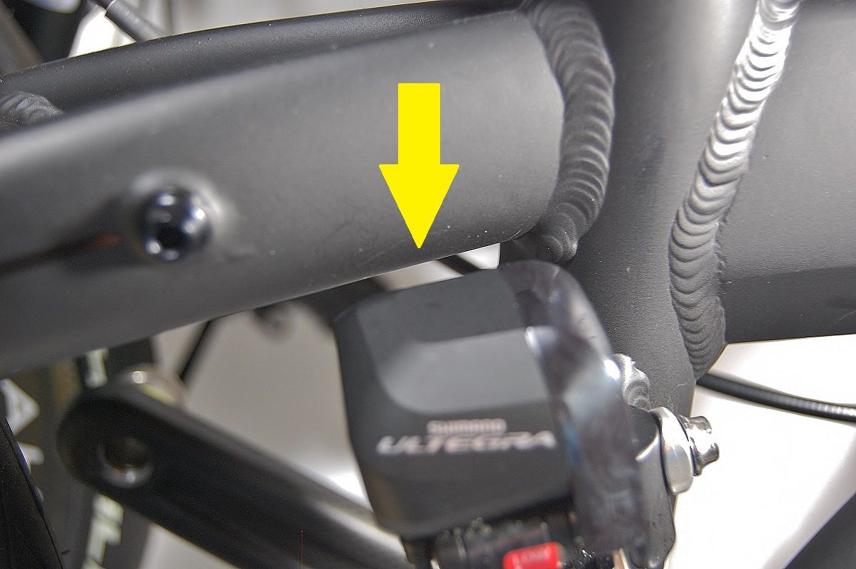 普通のフレームであれば、Lo アジャストボルトに当たった時点でインナーへのシフトが完了し、Hi アジャストボルト先端とアーム間に余裕が出ます。この余裕の範囲でHi アジャストボルトを回しても、何の変化もありません。シマノがマニュアルで「ロー側は、Loで、ハイ側は、Hi で調整しなさい」と明記しているのは、このことです。