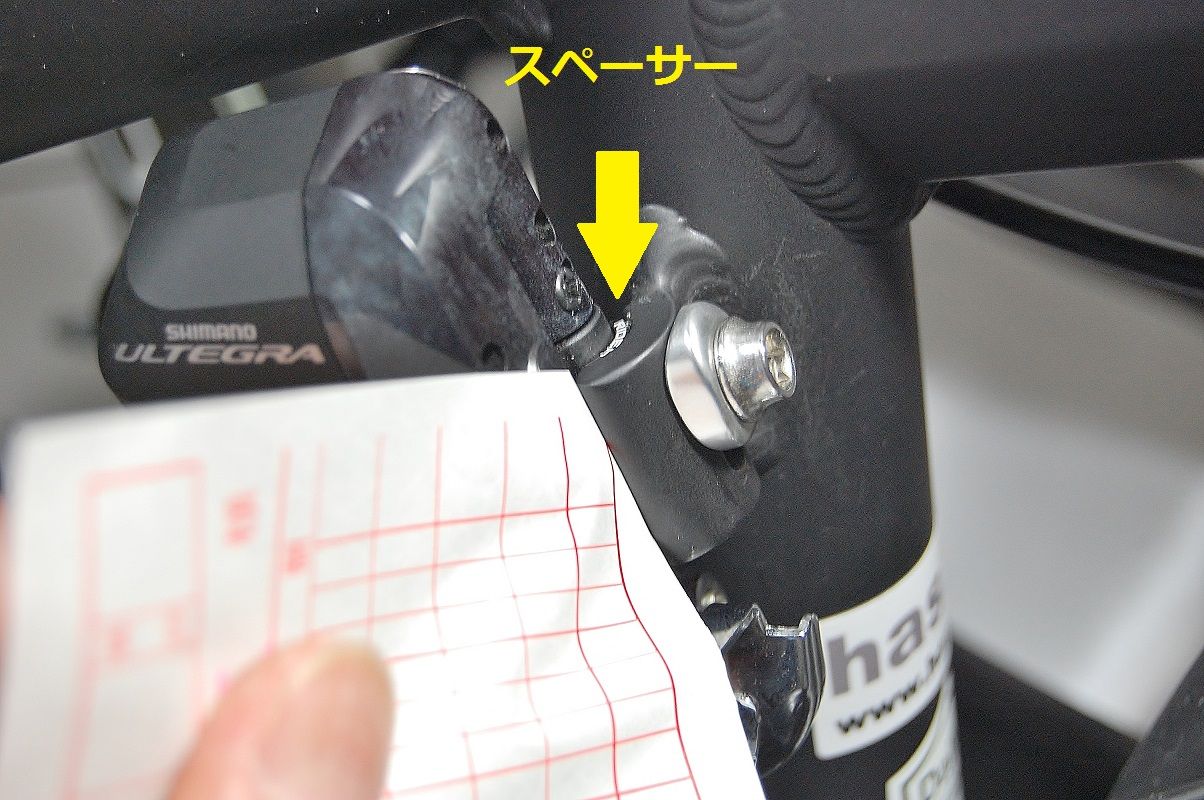 インナーにシフトしました。Lo アジャストボルトに当たって止まりましたから、Hi アジャストボルト先端とアームの間に隙間ができました。