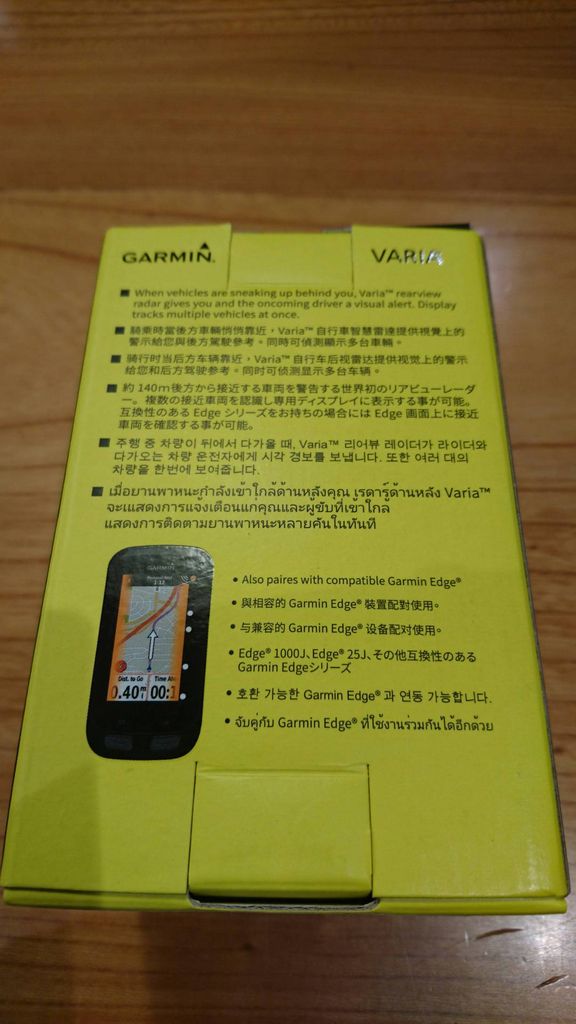 箱の裏面にも、「Edge 1000J, Edge 25J、その他互換性のある Garmin Edge シリーズ」と記載されていますね。また本体の特徴について、「約140m後方から接近する車両を警告する世界初のリアビューレーダー。複数の接近車両を認識し専用ディスプレイに表示する事が可能。互換性のある Edge シリーズをお持ちの場合には Edge 画面上に接近する車両を確認する事が可能」とされています。この段階で、すでに期待を大きく膨らませてワクワクしてしまっているのは私だけでしょうか。。