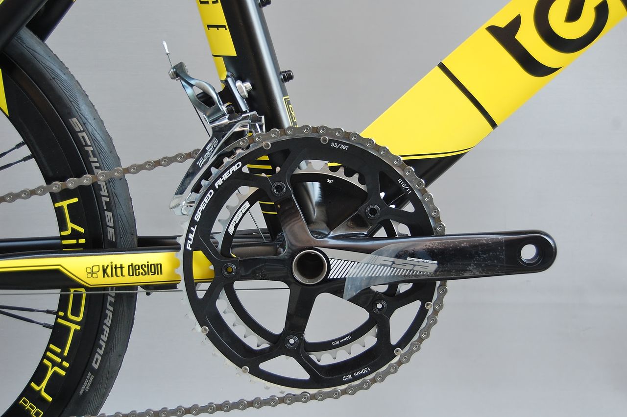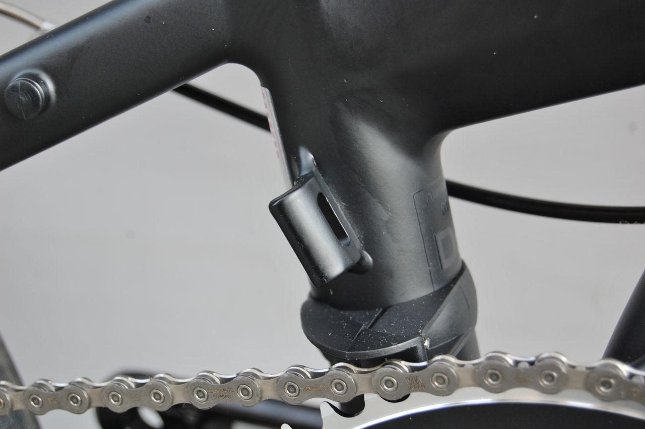 将来的なフロントダブル化に備え、フロントディレーラー台座とアウター受けを設けた嬉しい装備。