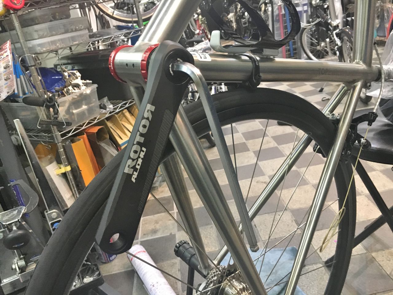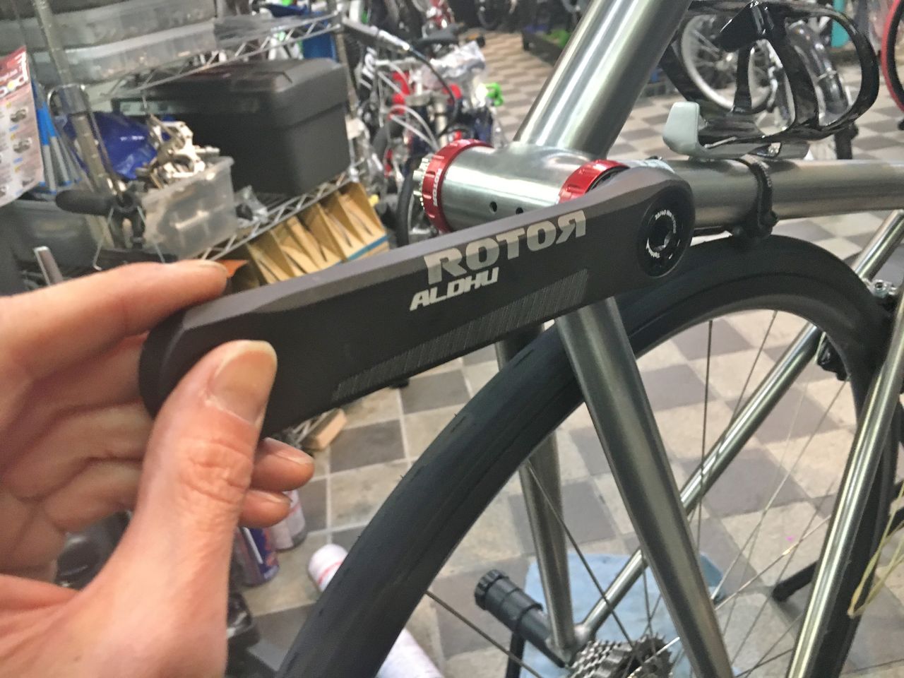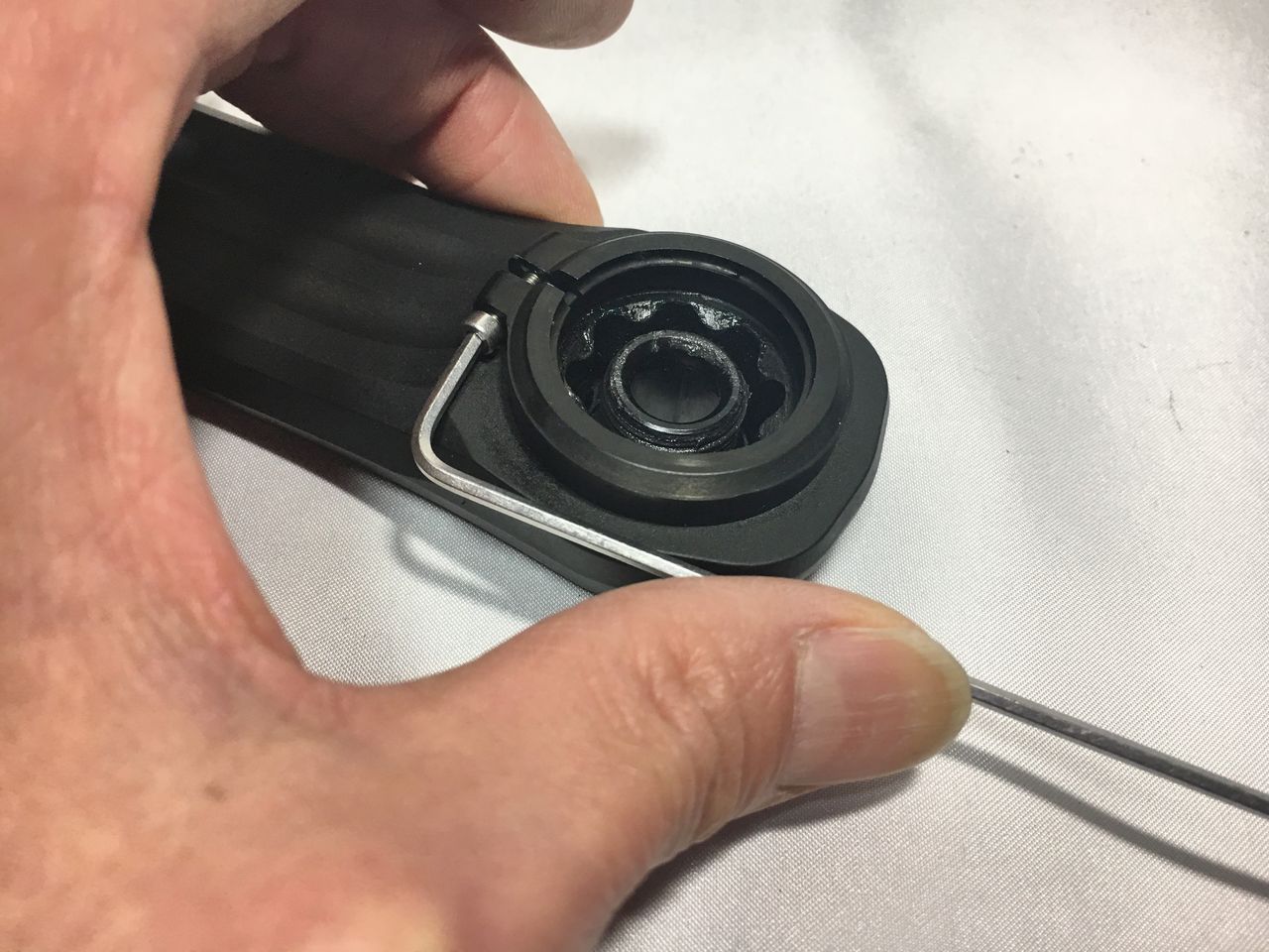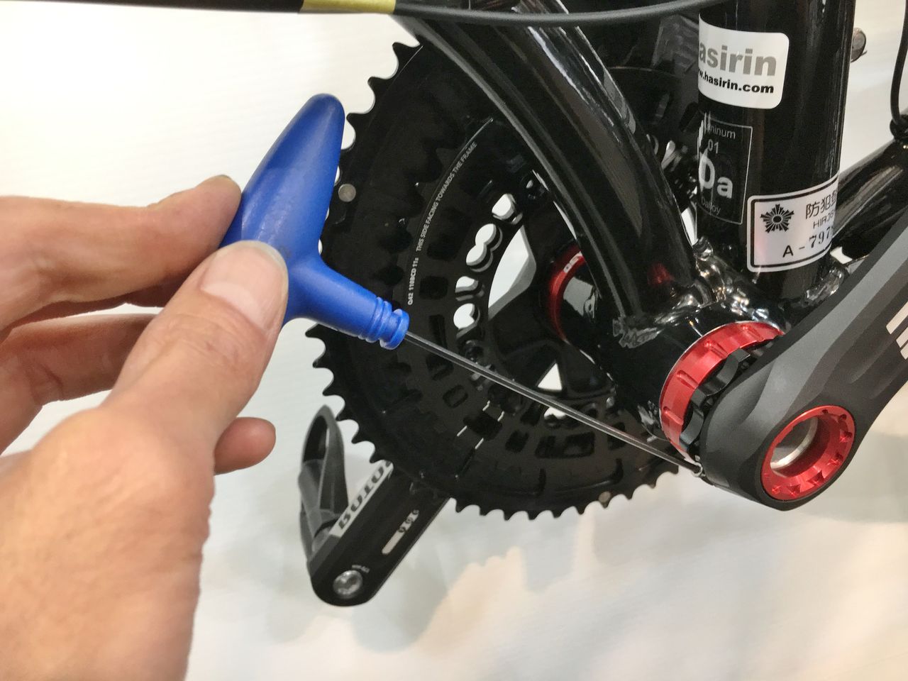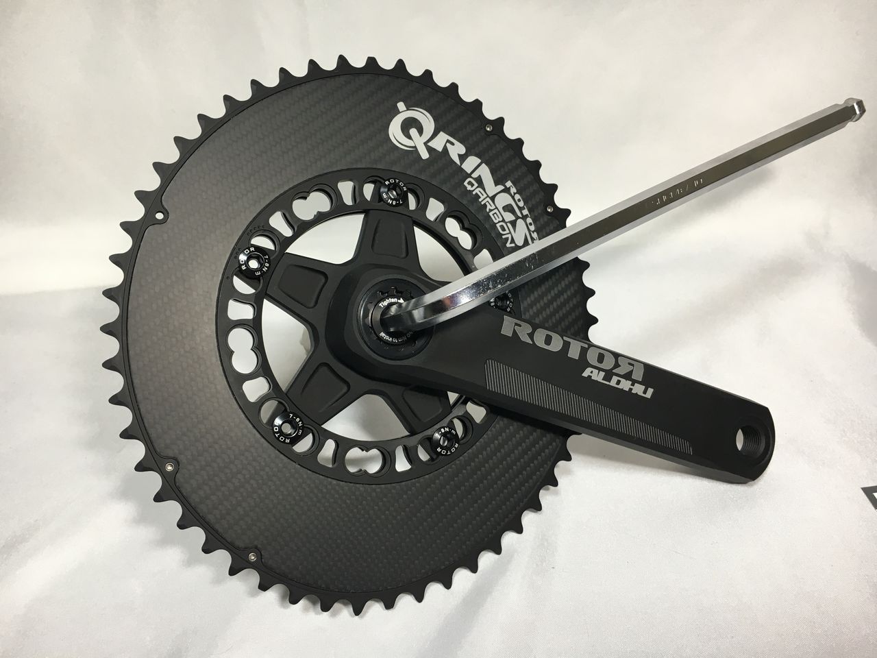 左クランクアームだけを取り付けてフィキシングボルトをレンチが止まるまで軽く締め込みました。