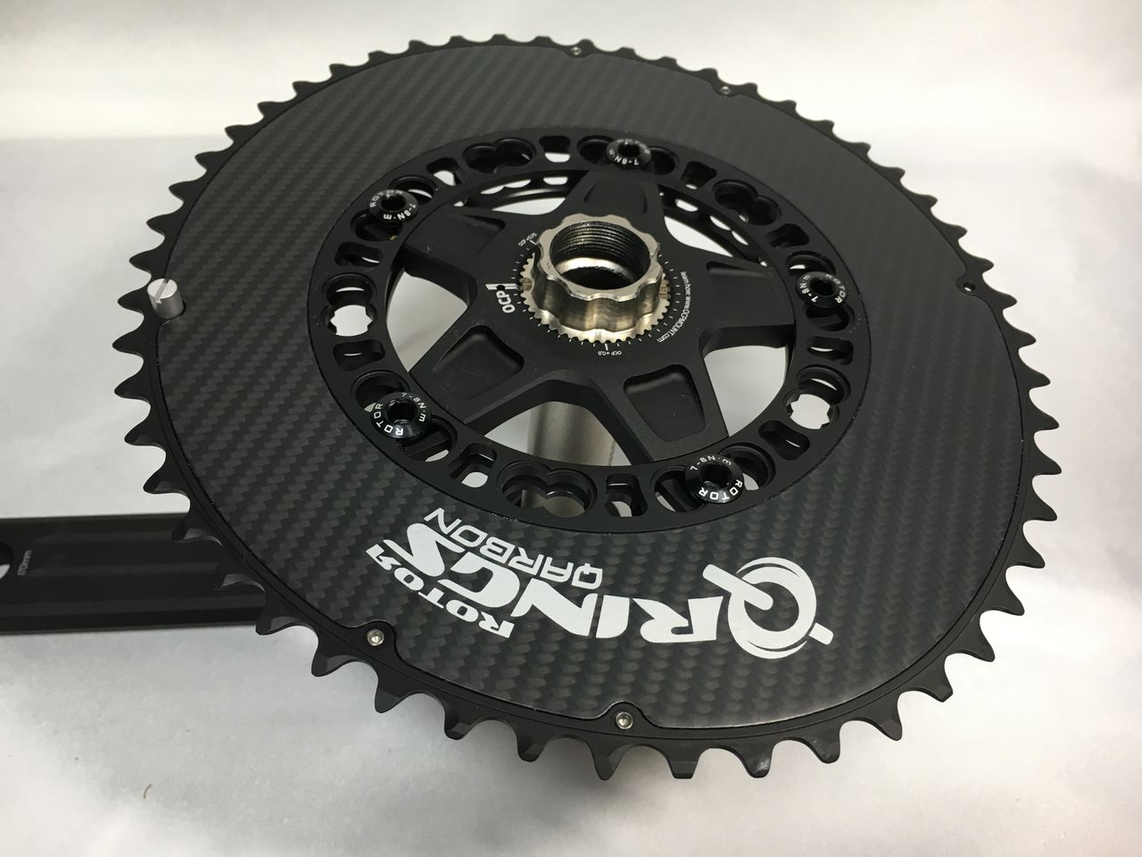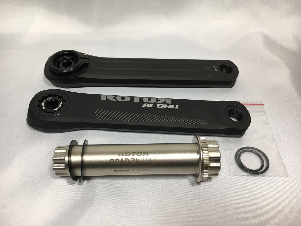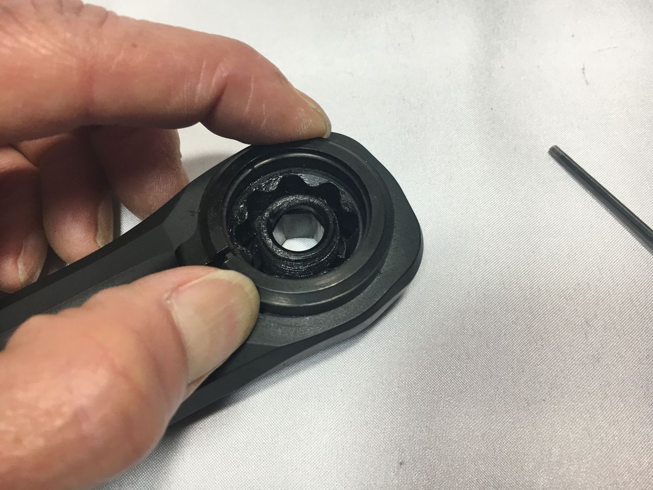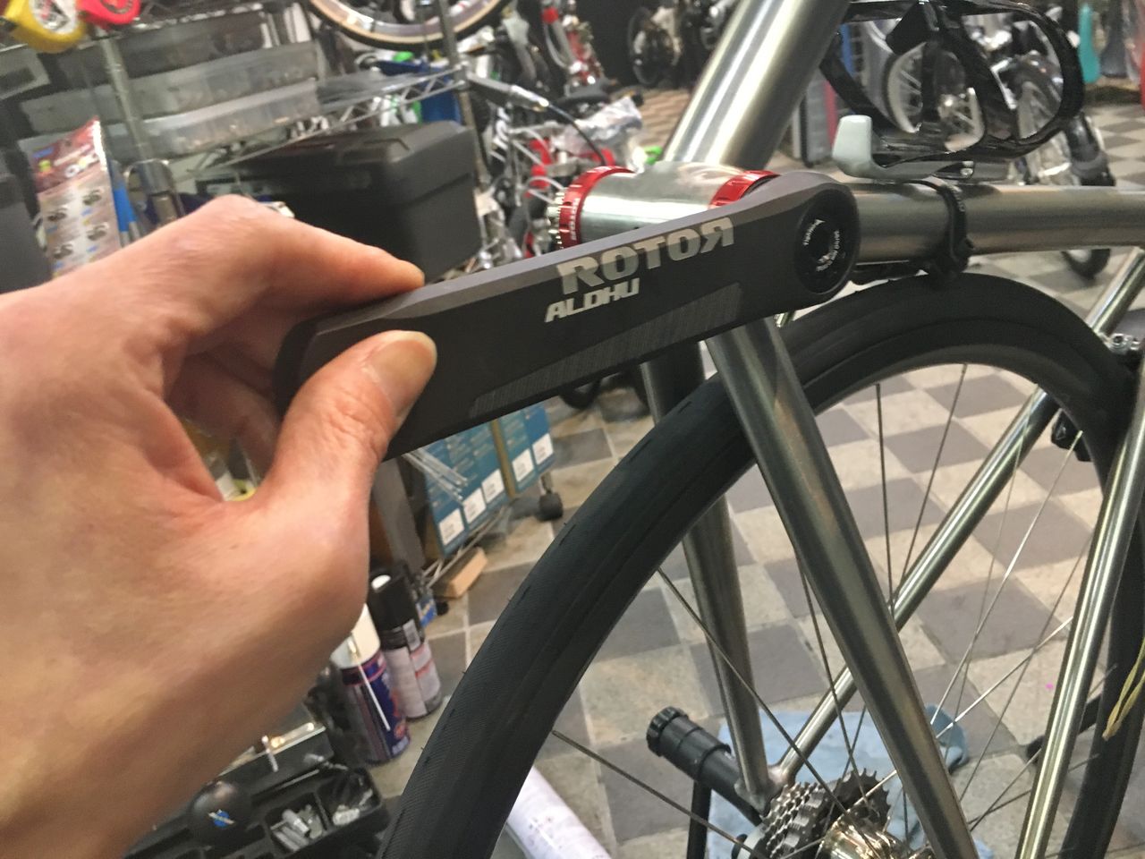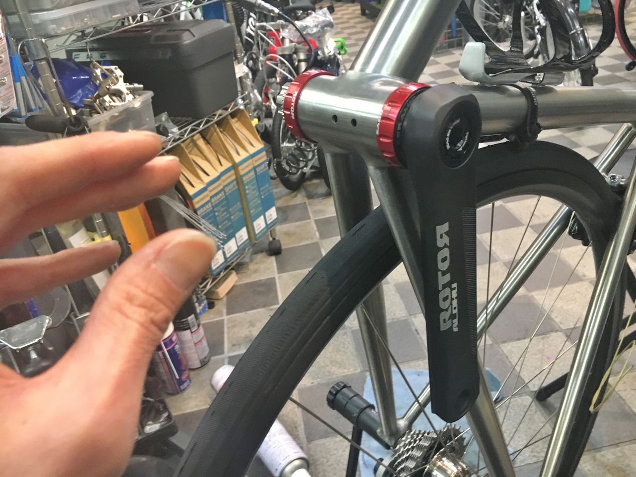 左クランクアームだけを取り付けてフィキシングボルトをレンチが止まるまで軽く締め込みました。
