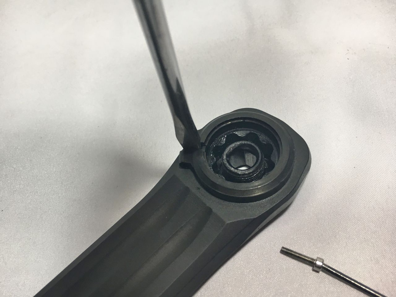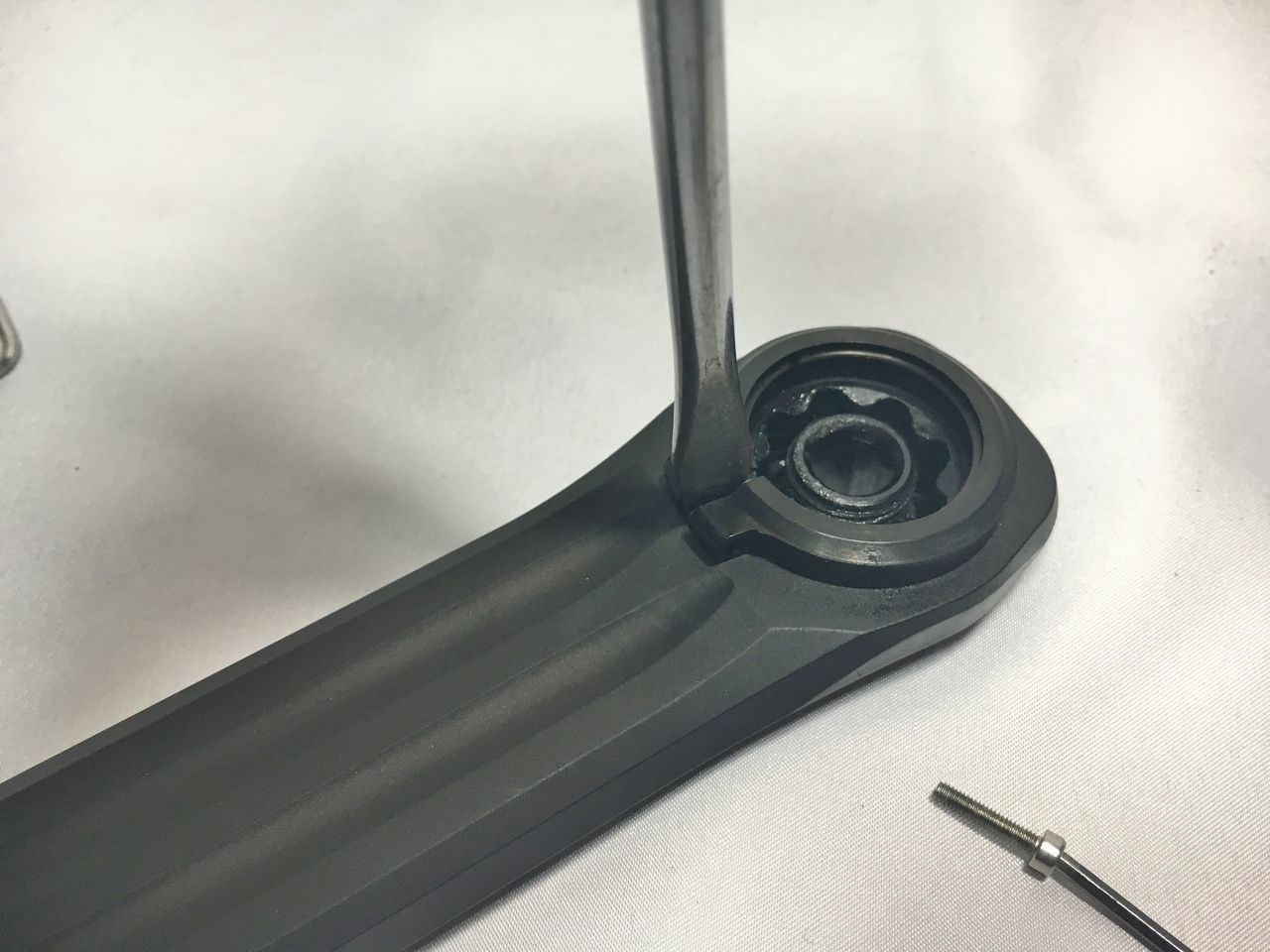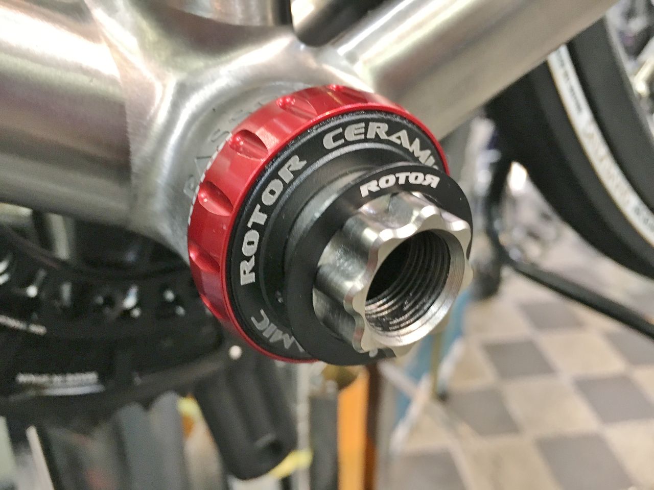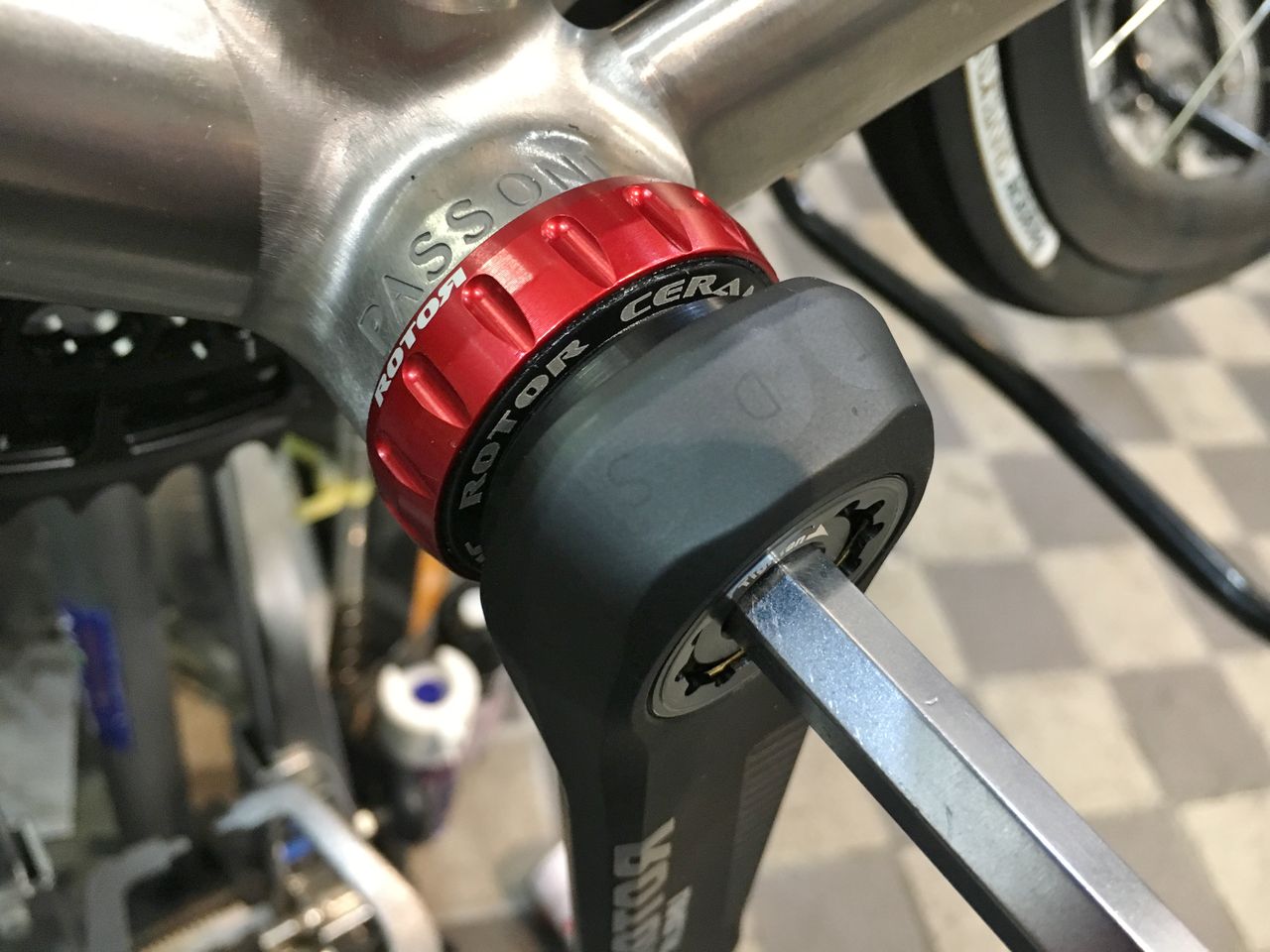 プリロードナットの回し方は後に考えるとしてフィキシングボルトを締め込んでみる。あれ、固くなる以前にBBにくっ付いちゃったよ!
