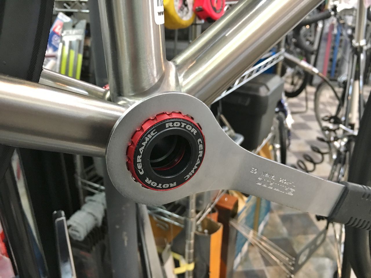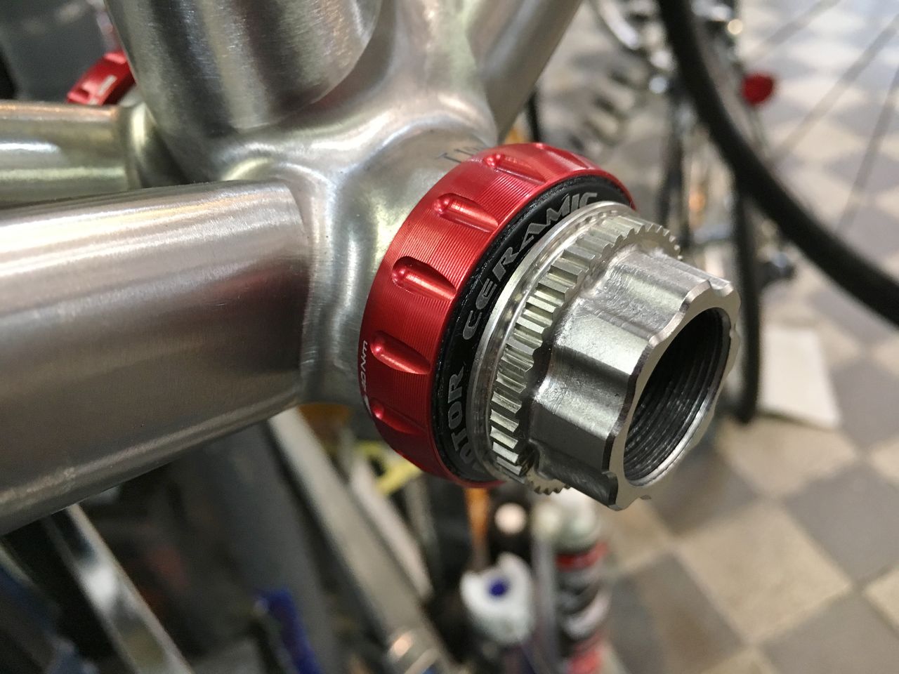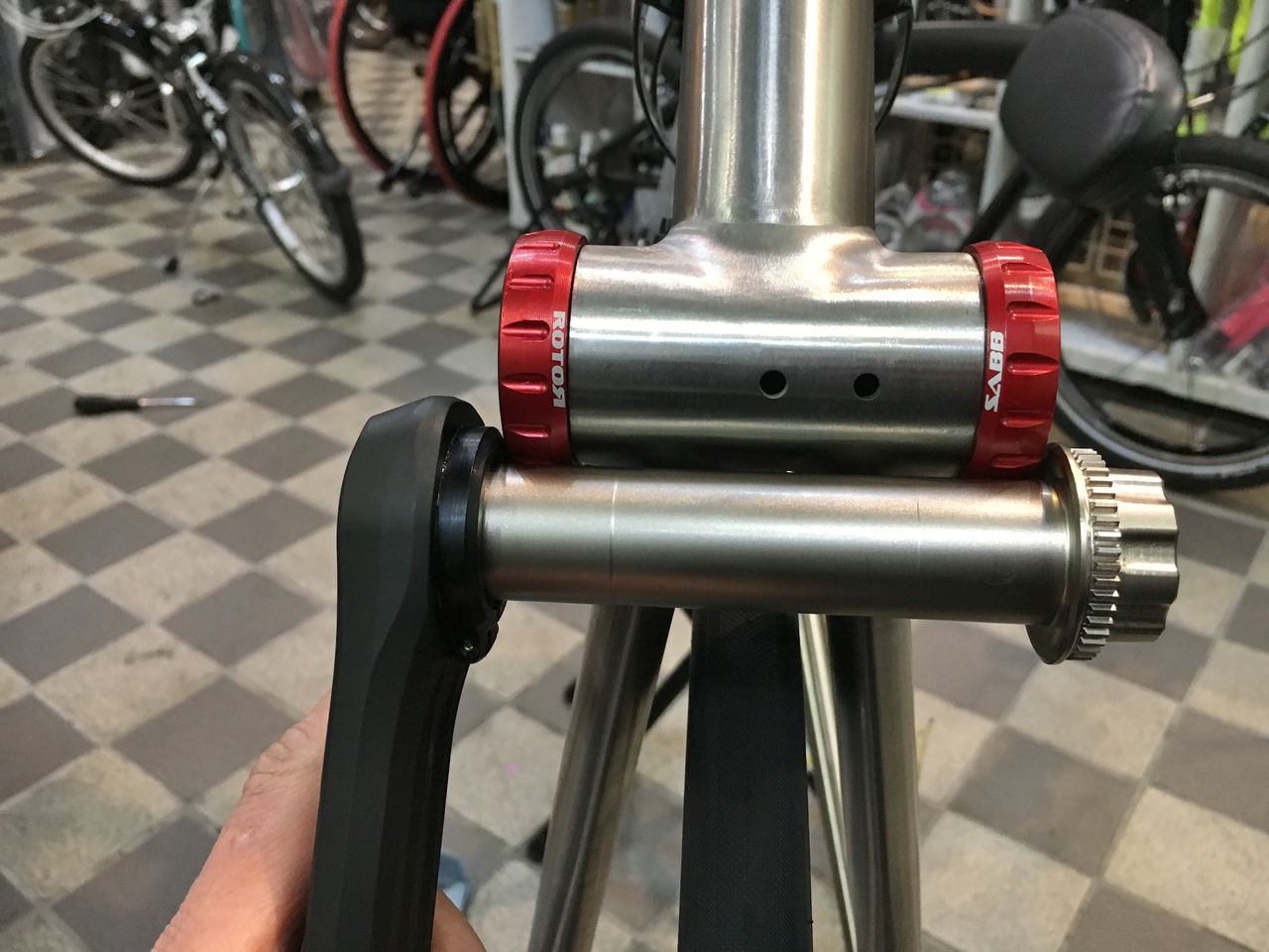 プリロードナットの回し方は後に考えるとしてフィキシングボルトを締め込んでみる。あれ、固くなる以前にBBにくっ付いちゃったよ!