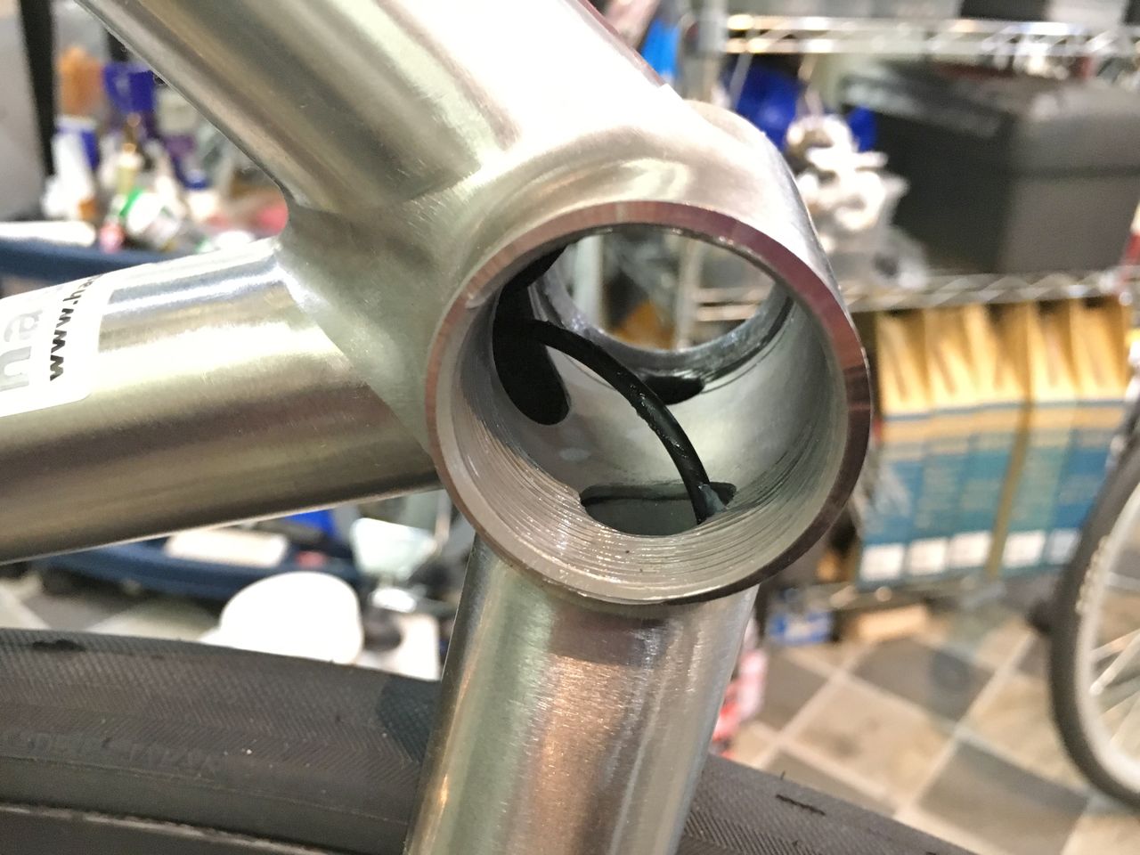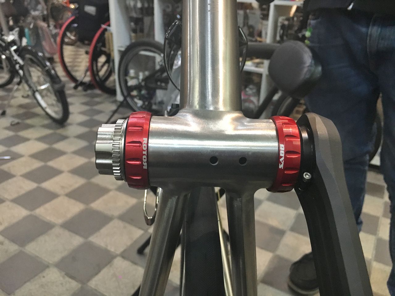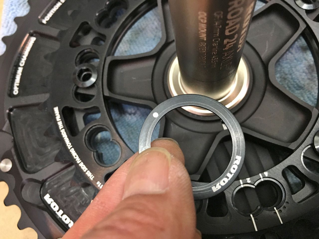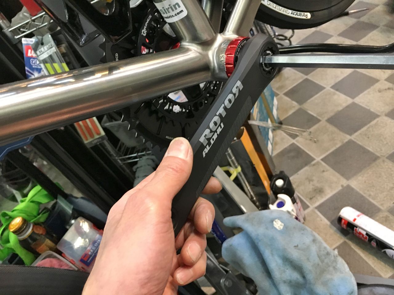 プリロードナットの回し方は後に考えるとしてフィキシングボルトを締め込んでみる。あれ、固くなる以前にBBにくっ付いちゃったよ!