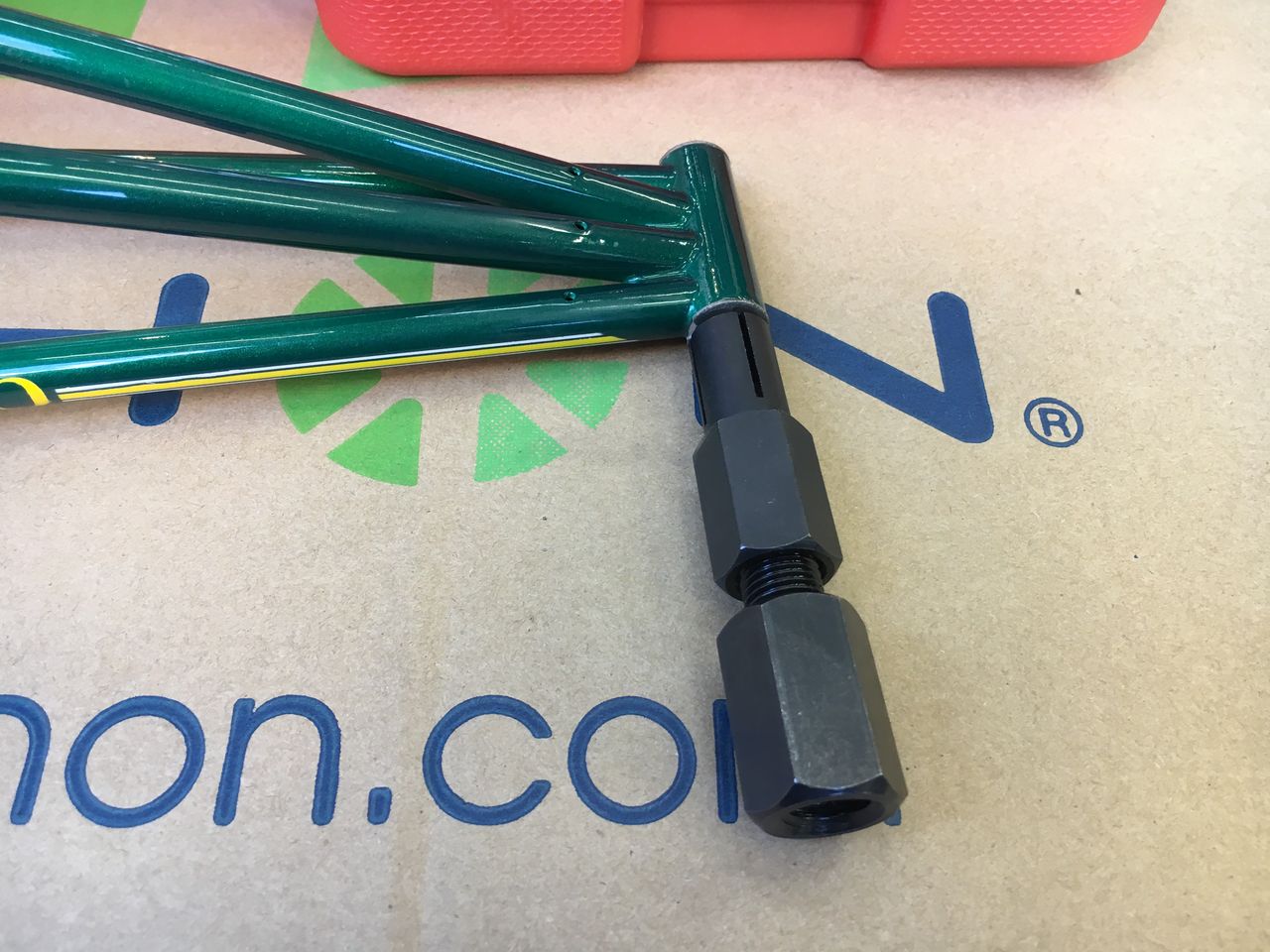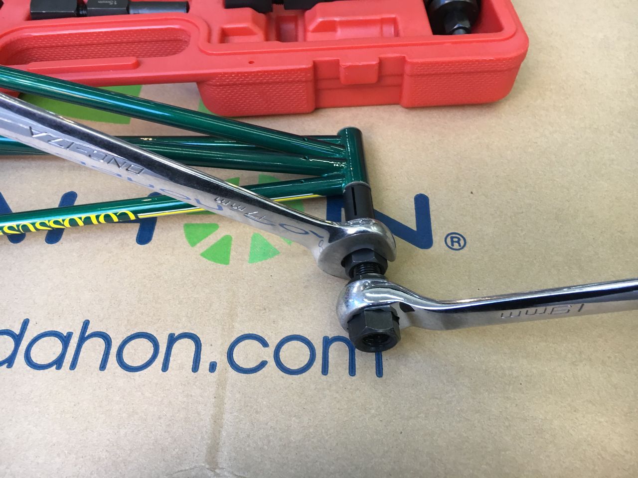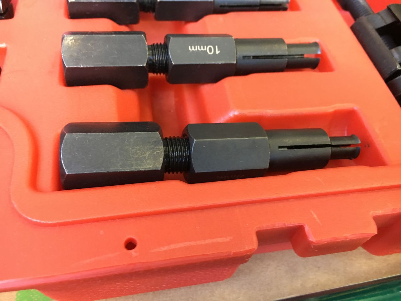 でもって購入したのがスライディングハンマー式ベアリングプーラー。内径8〜30mm のアダプターと2種類のブッシュプーラー、スライディングハンマが入って税別の19.800円。10年前なら5万円くらいした代物だ。特殊工具も安くなったもんだ。購入した店舗に8mm に対応するベアリングプーラーセット3種類あったけどこのDUブッシュにピッタリ合ったのはこのセットだけ。やっぱこういうもんは、通販じゃ買えないな。