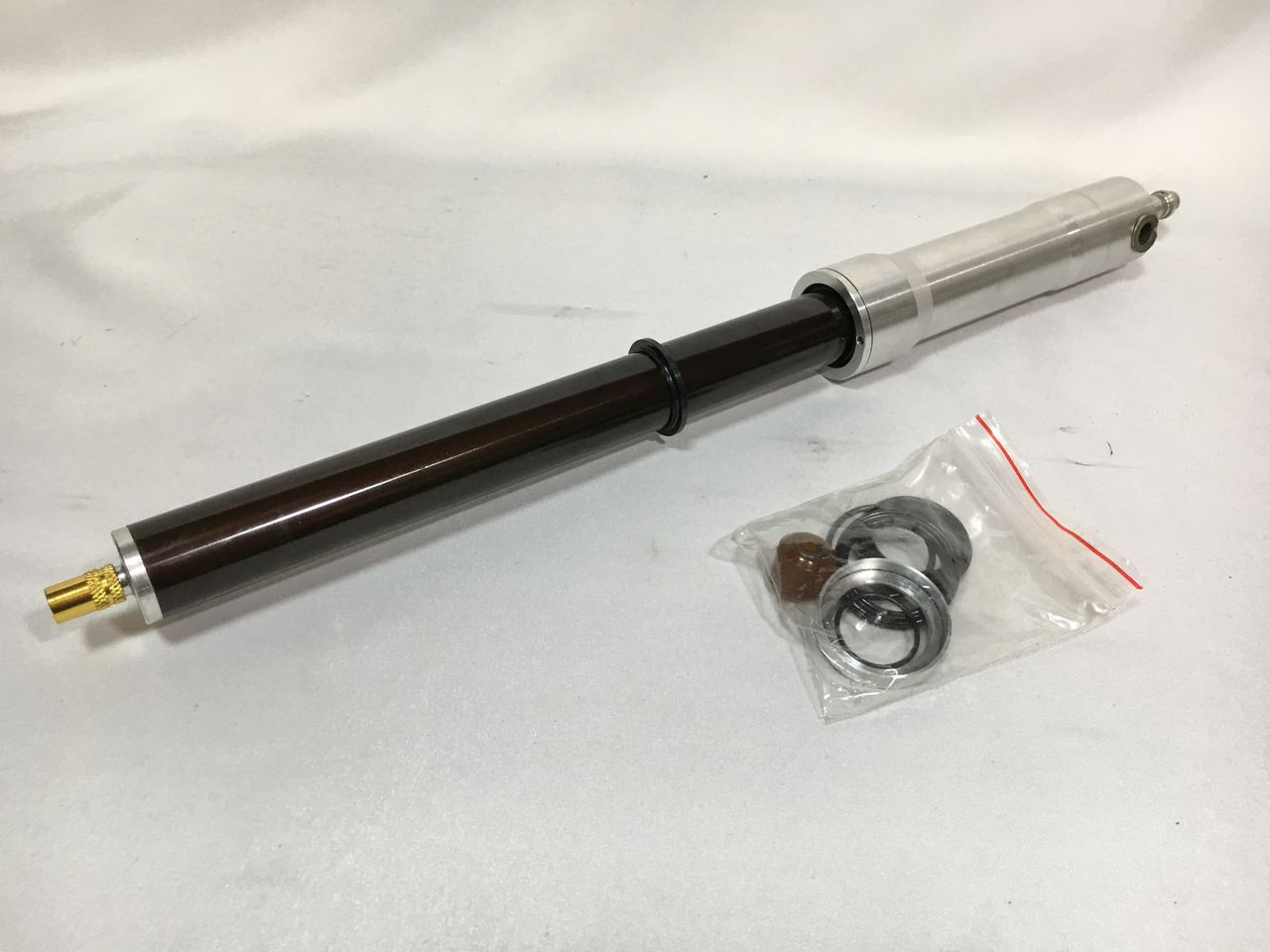 オーバーホールされKIMORI ファクトリーから戻ってきたフロントダンパーユニット。小袋は、交換されたオイルシール関係。