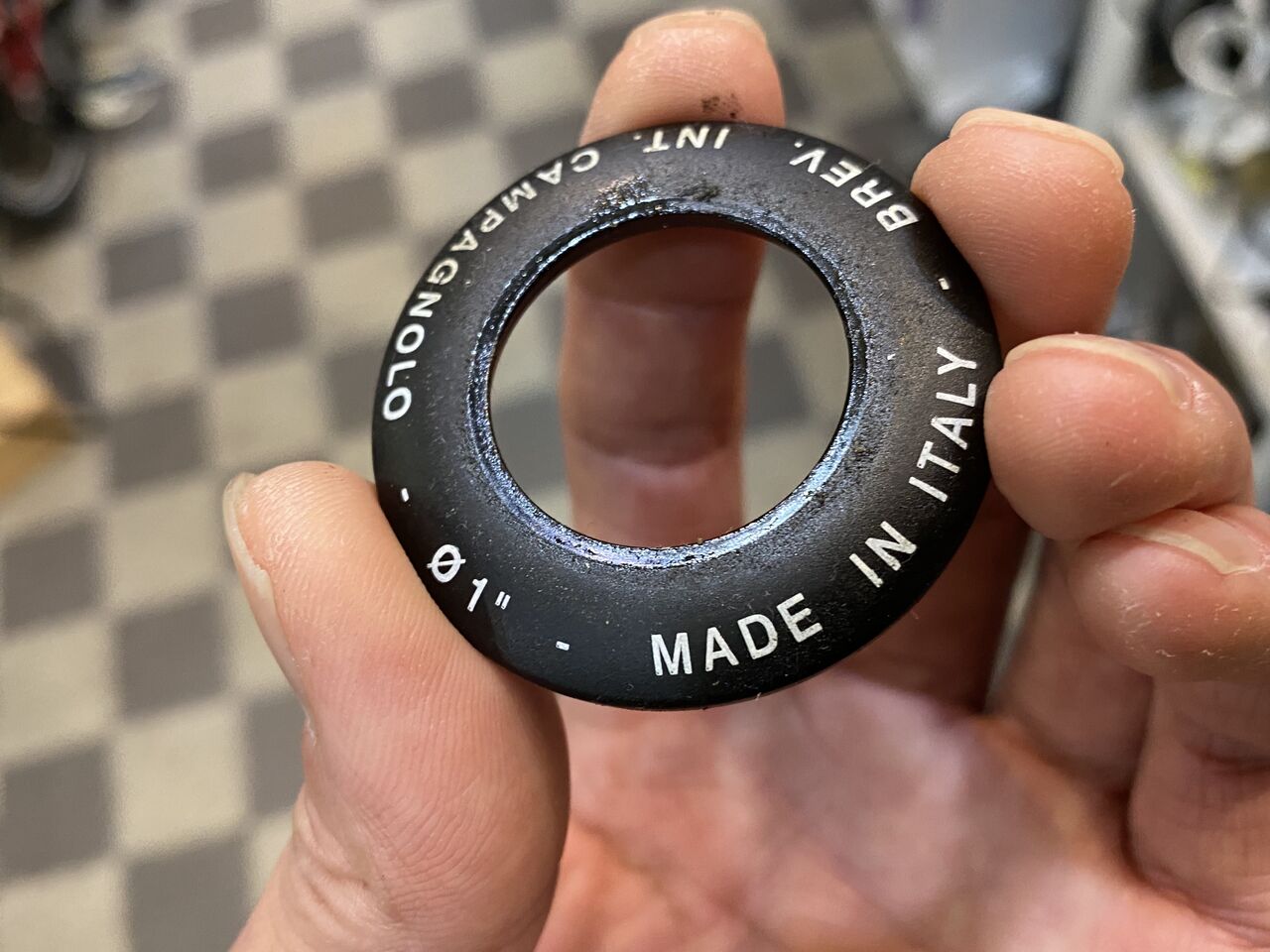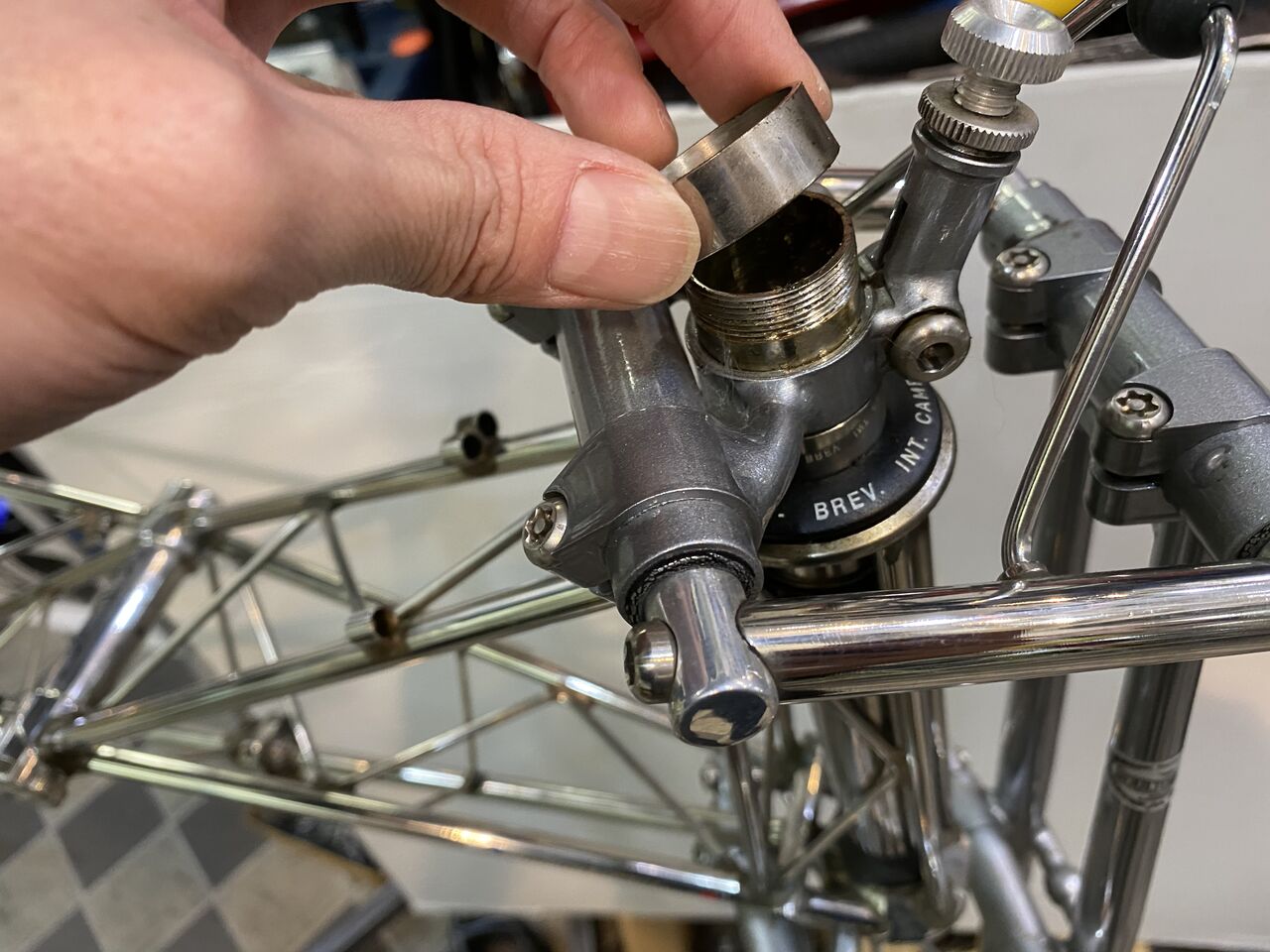 セラミックベアリングに洗浄液が回らぬようアルミカラーを抜いて蓋としました。プラスねじ頭が手前の目印。
