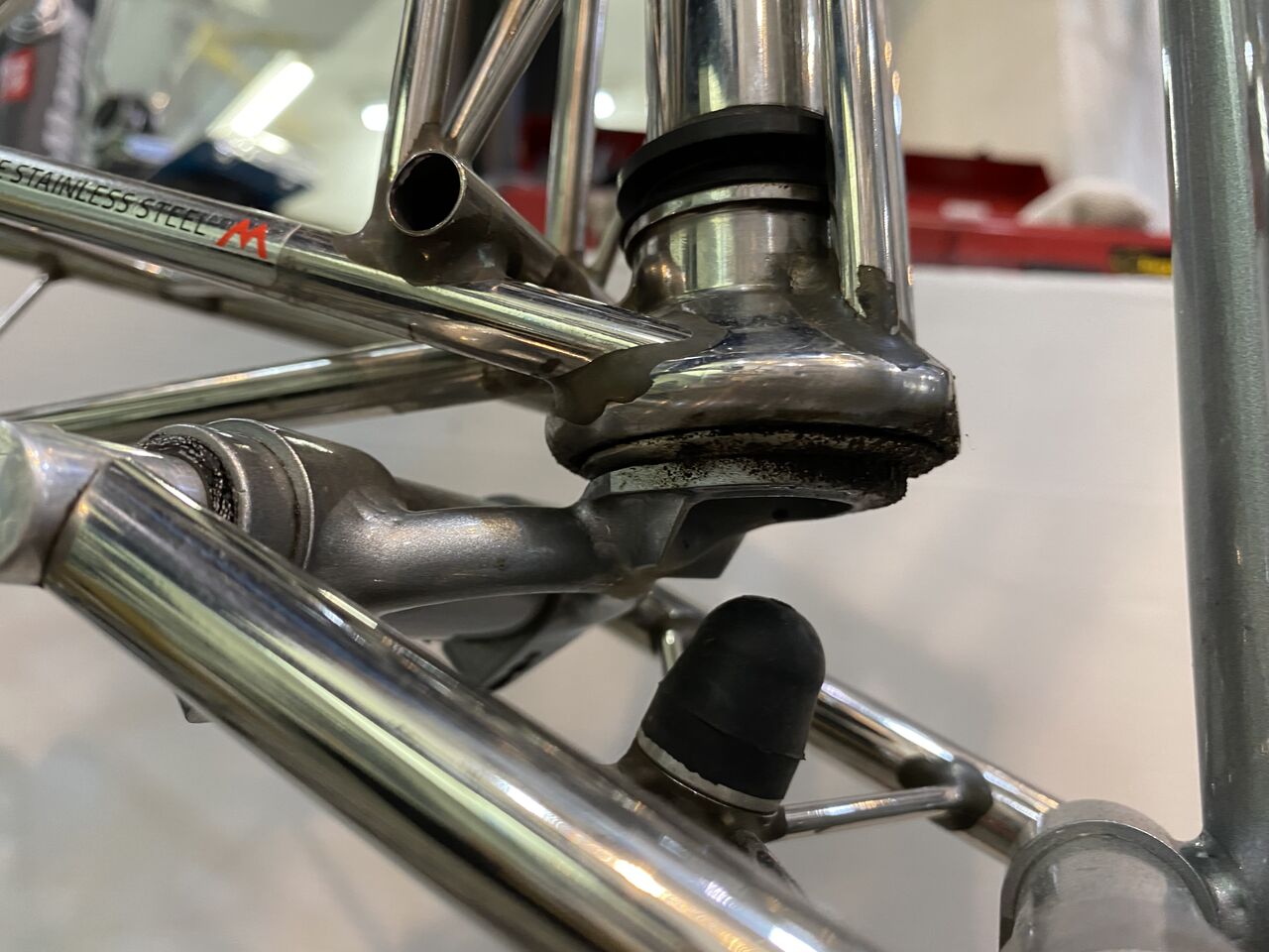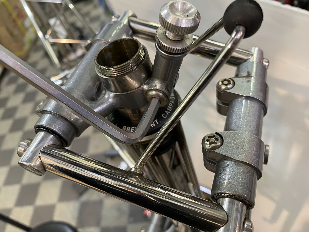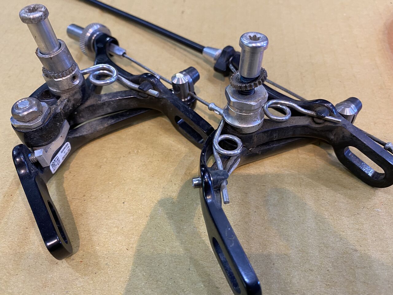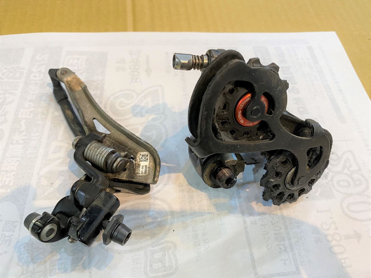 ブレーキキャリパーもドロドロですね。スーパーレコードは、リヤブレーキロック対策でリヤのみシングルピポットになってます。