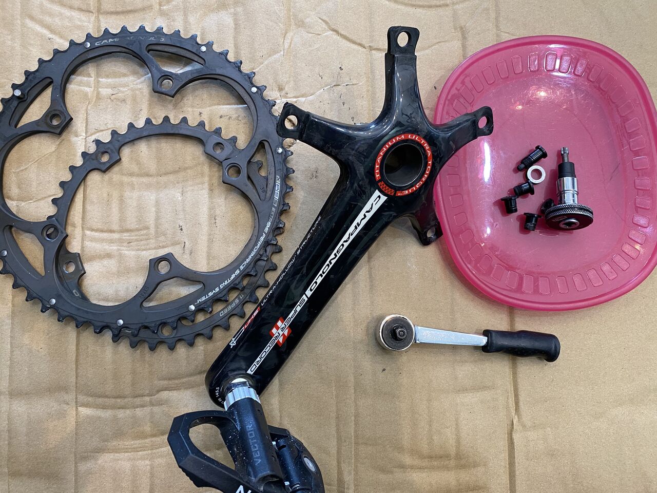 次にクランクからチェーンリングを外しておきます。カンパはチェーンリングボルトもトルクスですね。