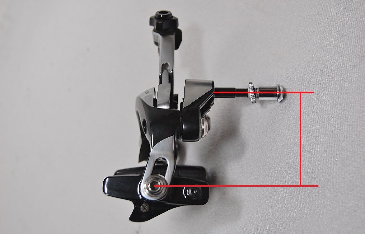 キャリパーブレーキでのリーチサイズとは、キャリパー取付ボルト中心からブレーキシュー取付ボルト中心までの距離で、シマノのロードコンポーネントで言えば51mm が主だ。BR-9000 DURA-ACE ごろまでは、49mm で、同世代の105 BR-5800 等が51mm。現在のラインナップ では、BR-R9100 DURA-ACE から BR-R3000 SORA までの全てが28c タイヤ対応のため51mm となっている。