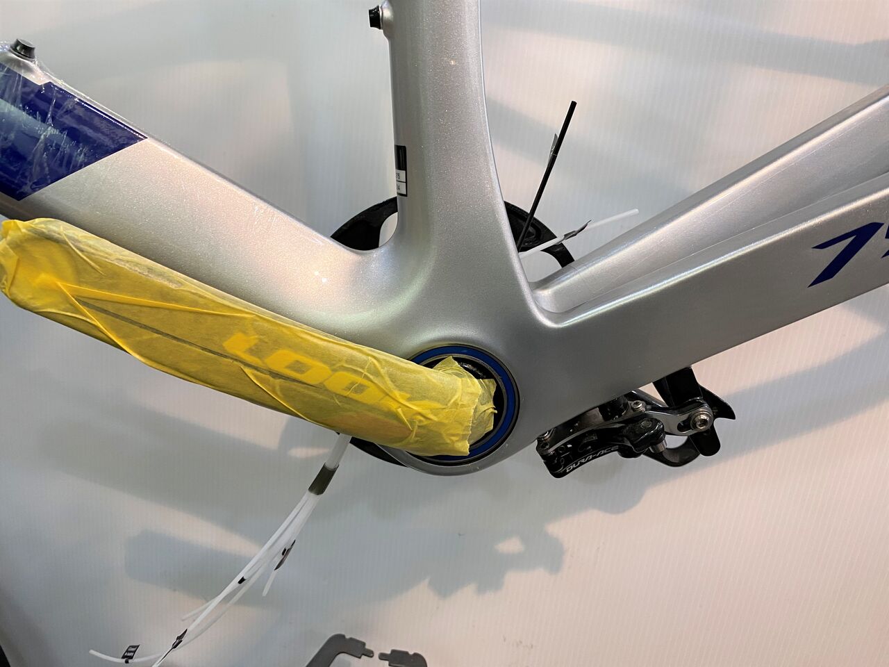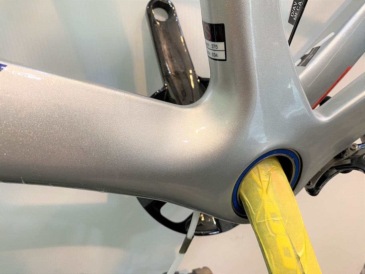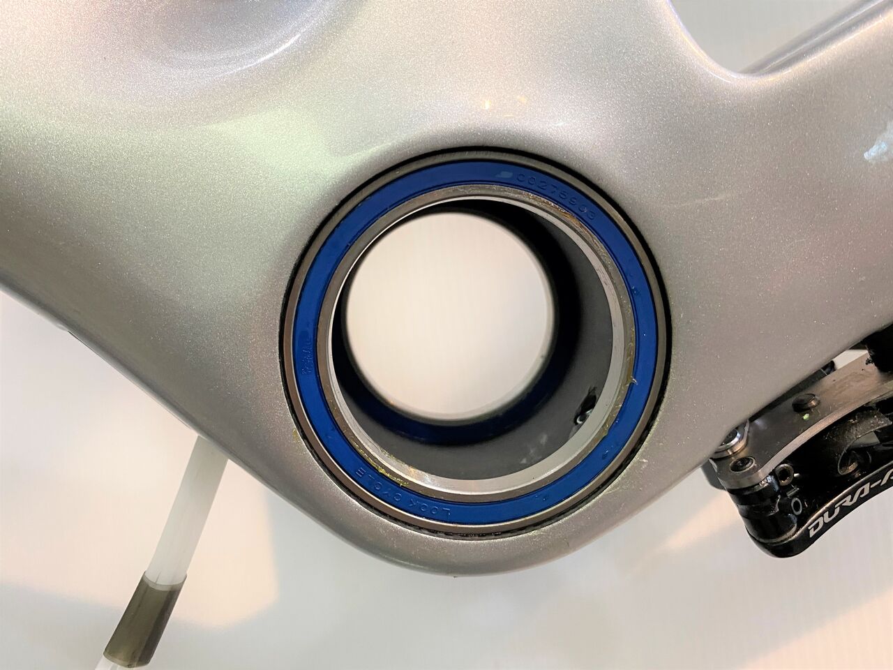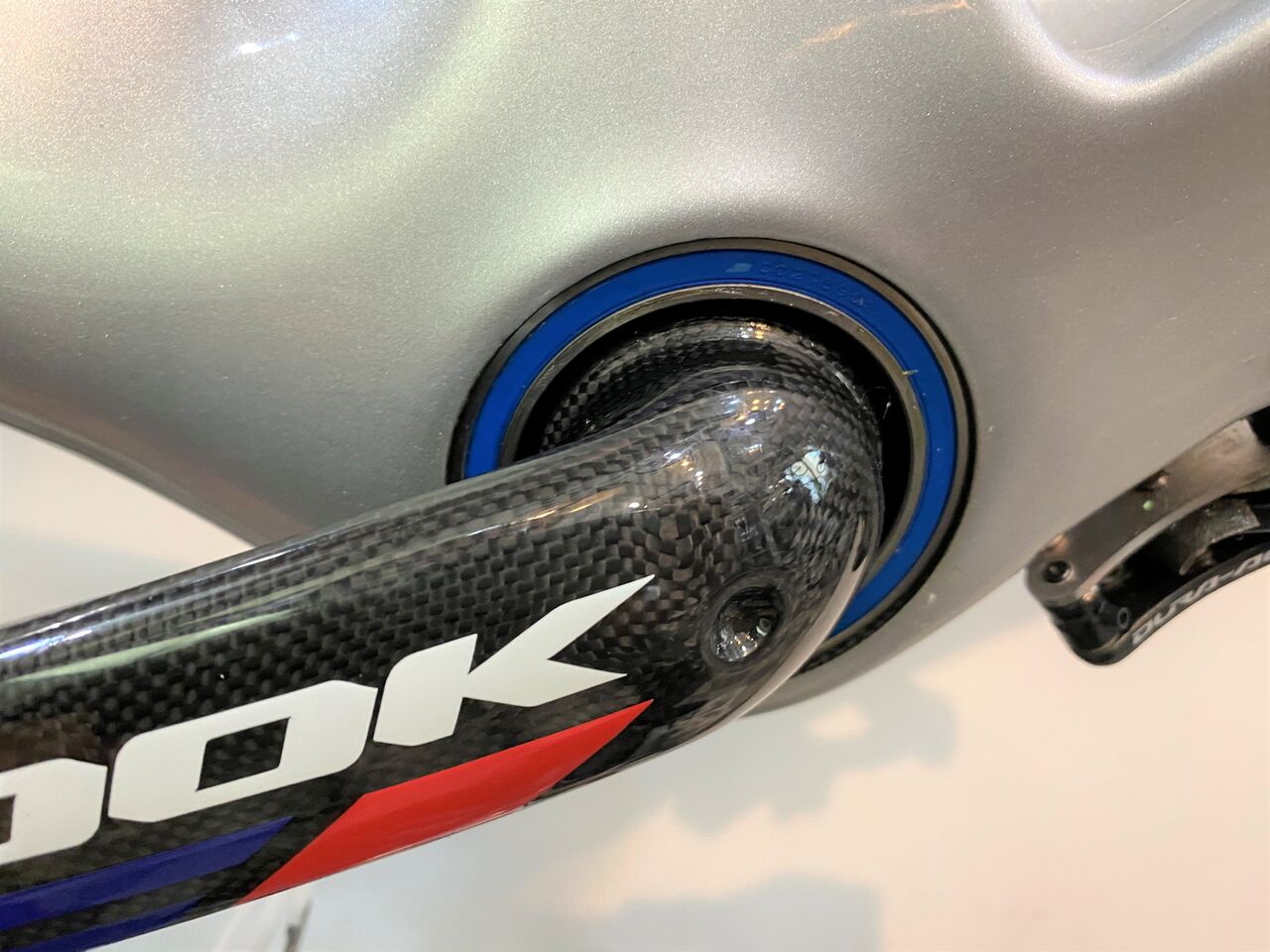 これでベアリングインナーレース、スリット付きリング、ロックリング、ワンピースクランクが一体になる。だから BB に見えたロックリングがクランクと一緒に回ってたんだね。初めて見たよこんなシステム。ただクランク入れた後にこのロックリング装着するのは簡単ではないと思う。