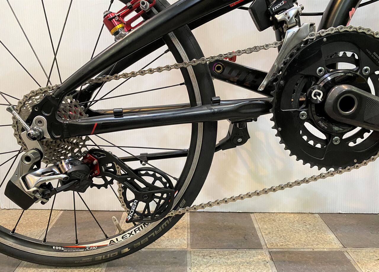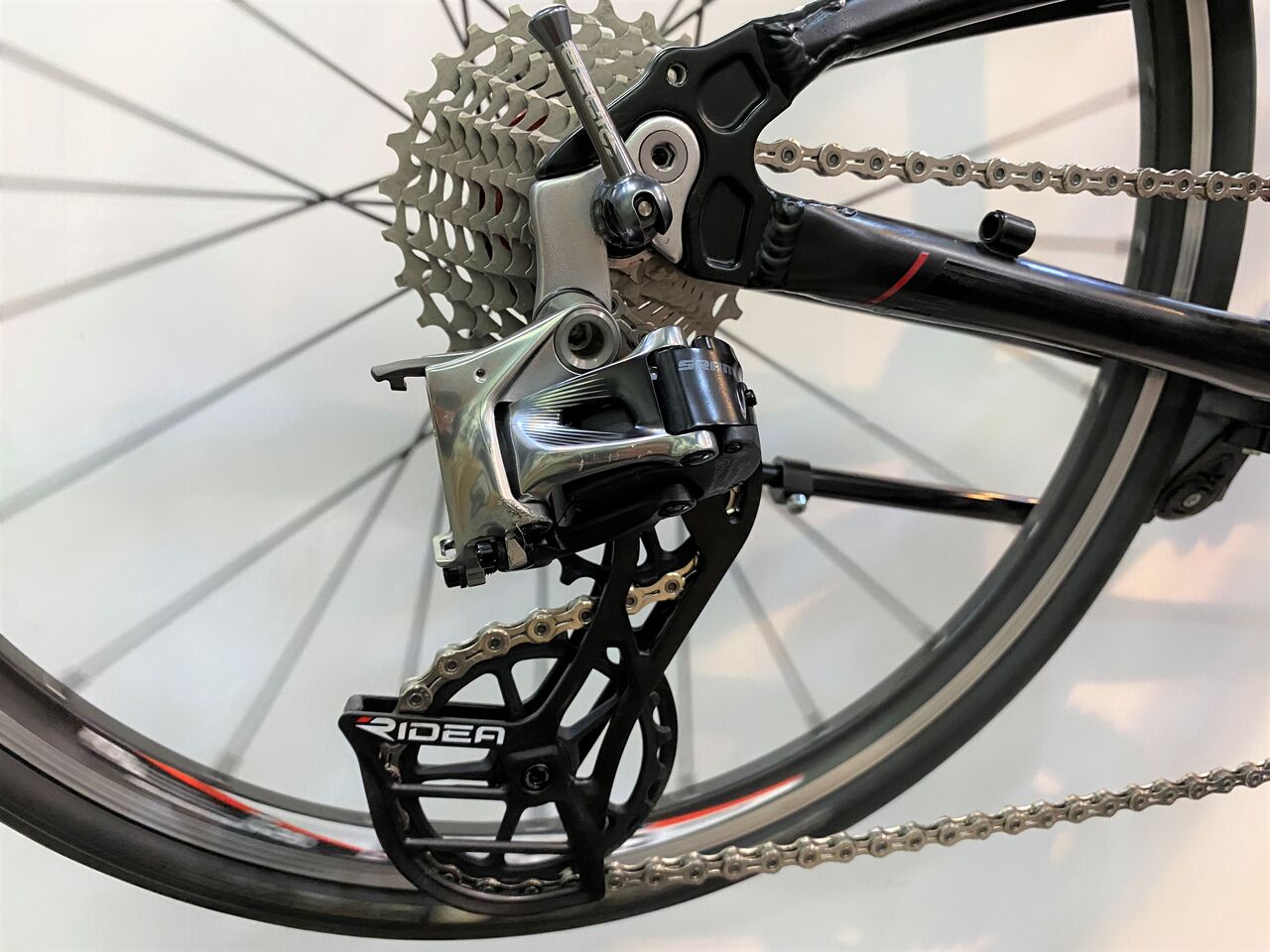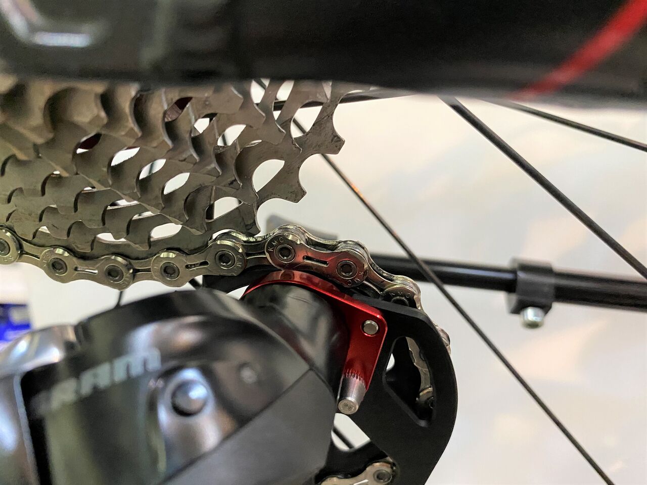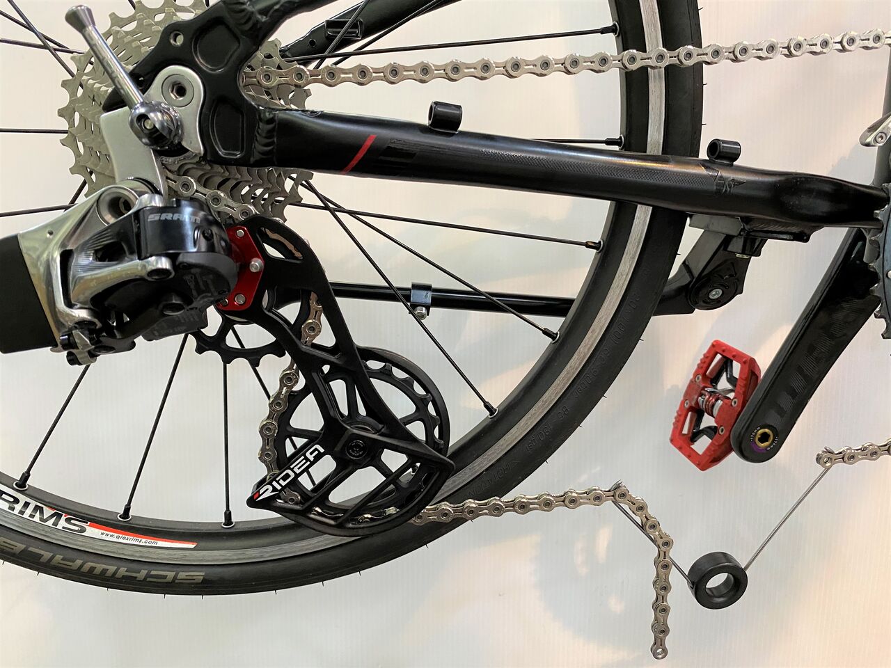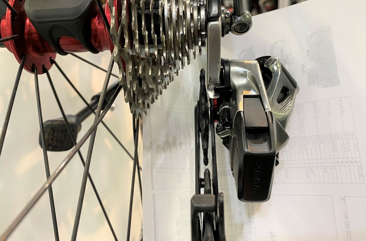 チェーン詰まりがなくなりかなり良い状態。クランキングがすこぶる軽いこの状態で止めておきたいが、SRAM RED リヤディレーラーの嫌な癖を知っているので予想しないバウンドなどでのチェーン落ちを恐れてもう1リンクチェーンをカットしチェーンテンションを上げてみた。