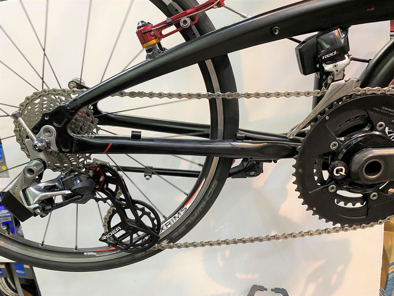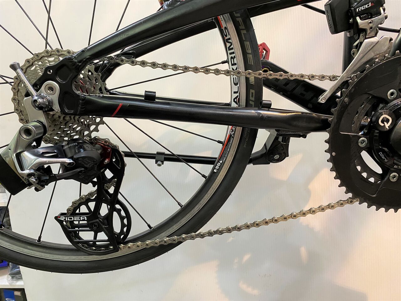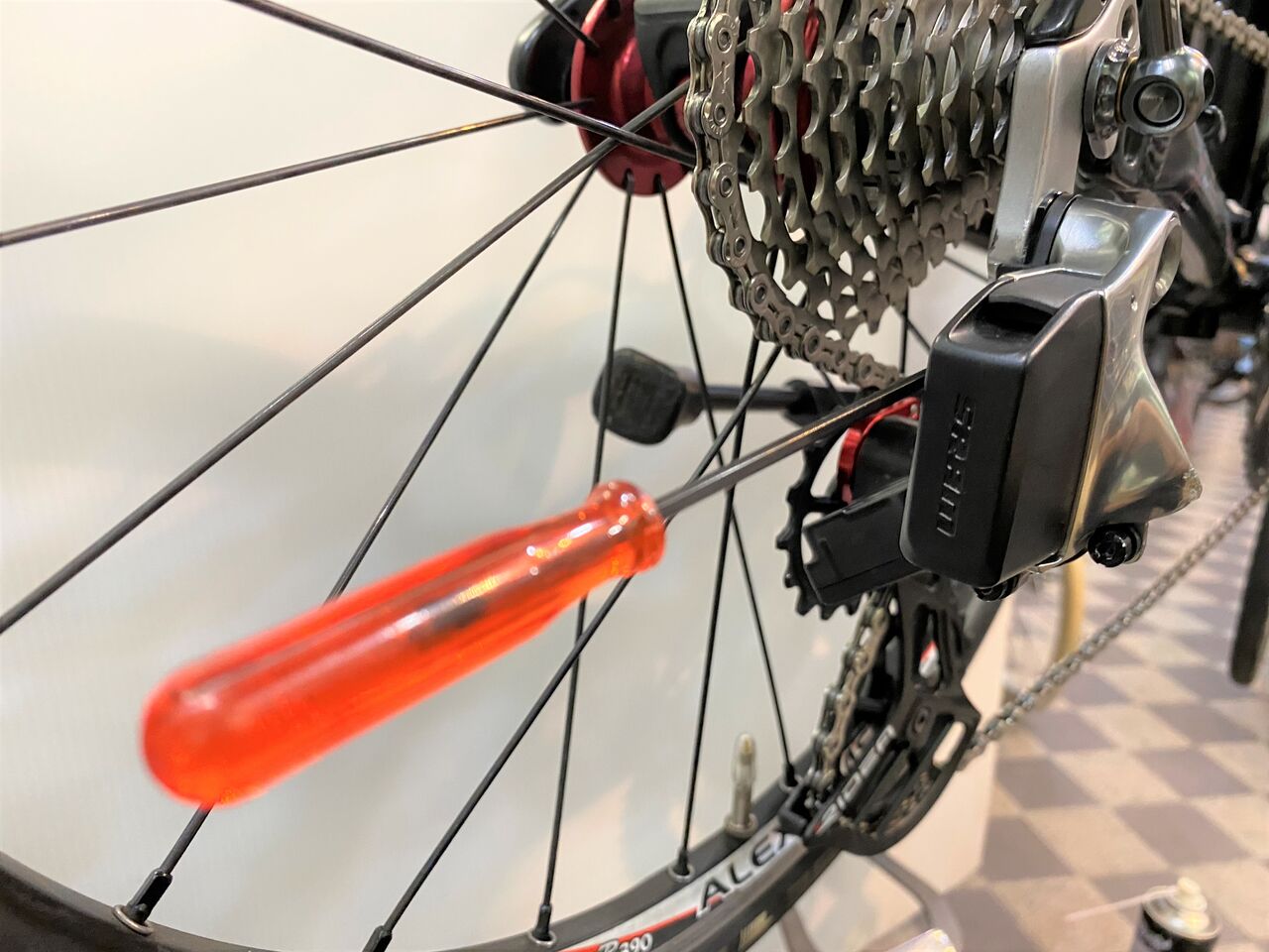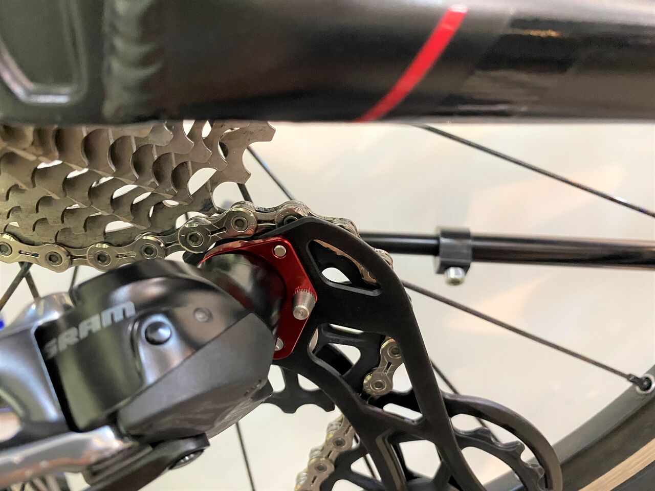 チェーン詰まりがなくなりかなり良い状態。クランキングがすこぶる軽いこの状態で止めておきたいが、SRAM RED リヤディレーラーの嫌な癖を知っているので予想しないバウンドなどでのチェーン落ちを恐れてもう1リンクチェーンをカットしチェーンテンションを上げてみた。