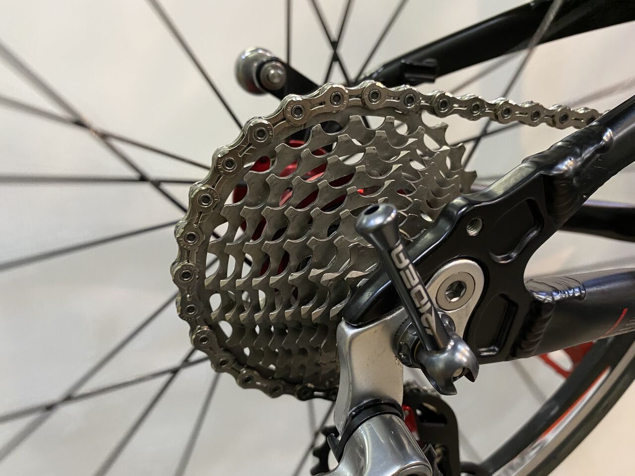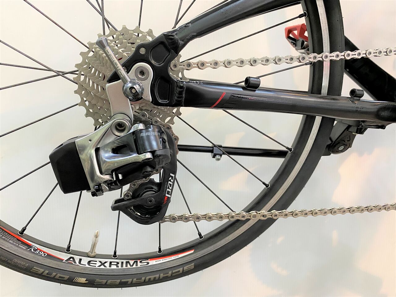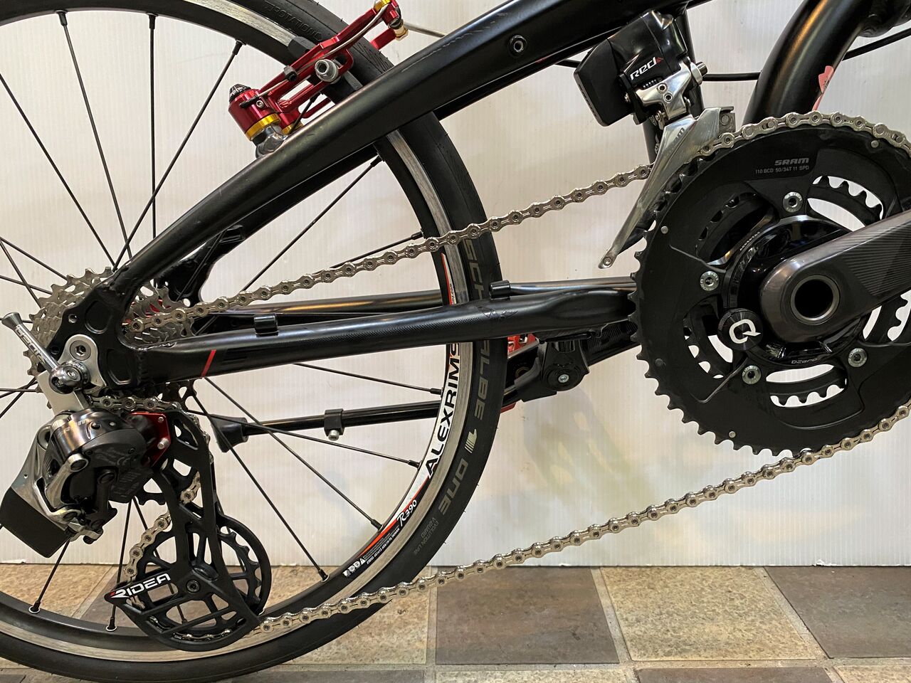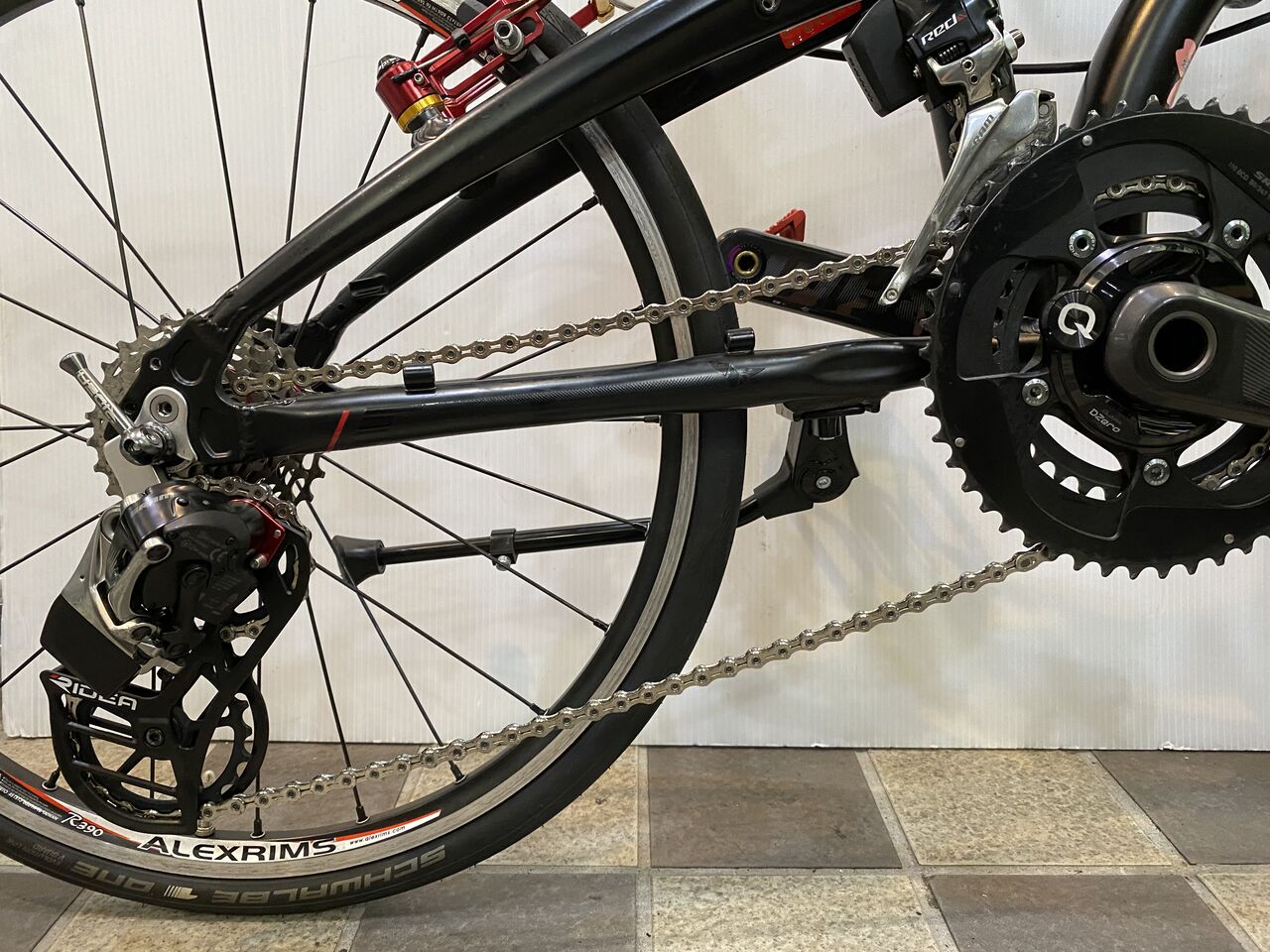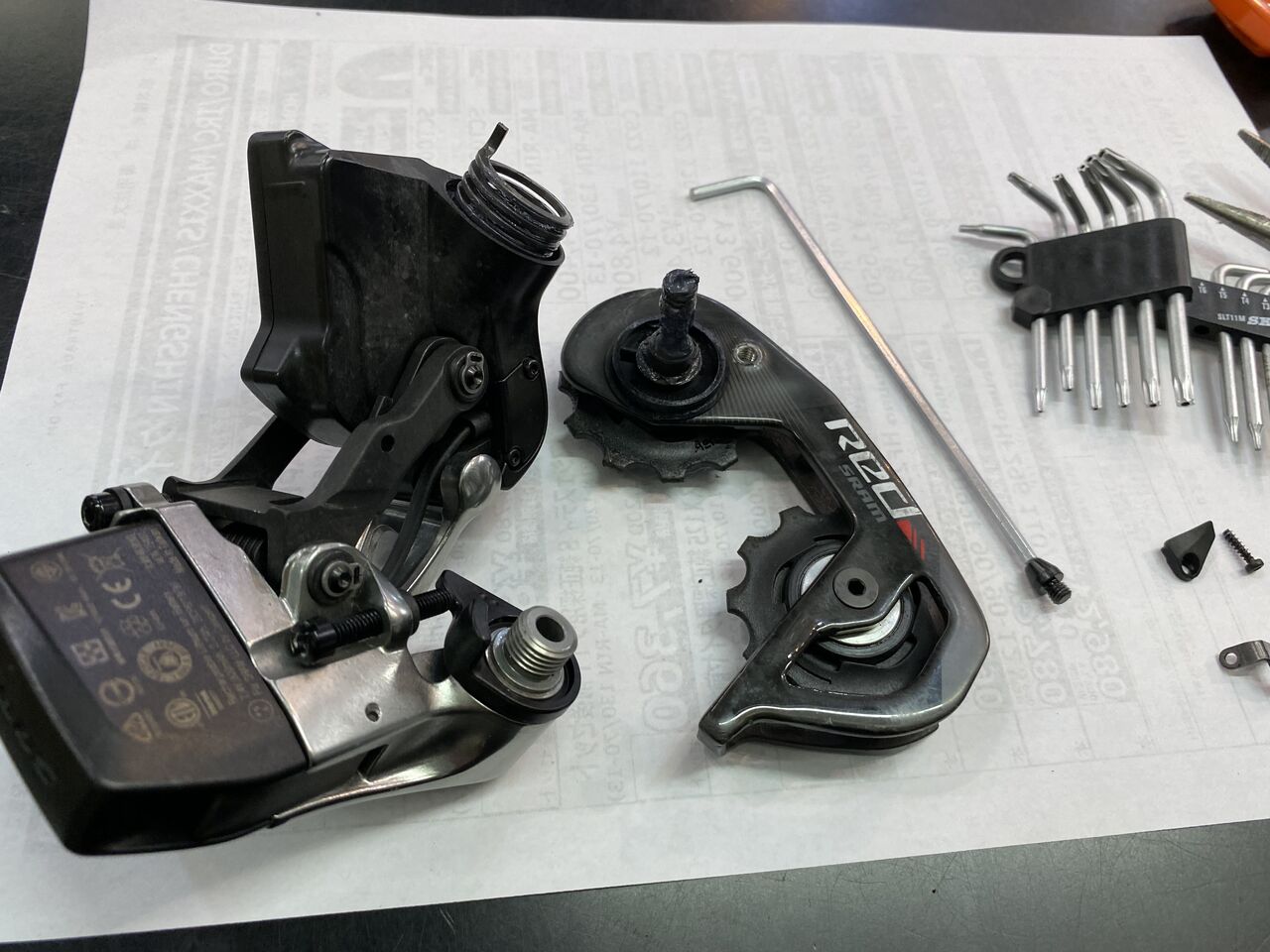 チェーン詰まりがなくなりかなり良い状態。クランキングがすこぶる軽いこの状態で止めておきたいが、SRAM RED リヤディレーラーの嫌な癖を知っているので予想しないバウンドなどでのチェーン落ちを恐れてもう1リンクチェーンをカットしチェーンテンションを上げてみた。
