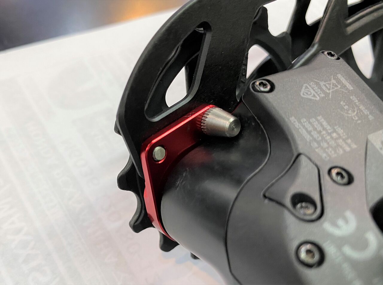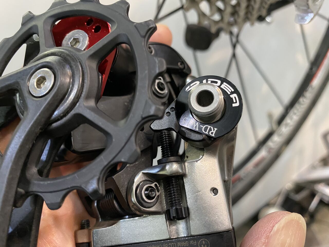 B テンションボルトを緩めていきガイドプーリーとロースプロケットをどんどん近づけて行きます。SRAM ですと6〜8mm となっていますが、接触してチェーン詰まりが起きるギリギリまで緩めます。