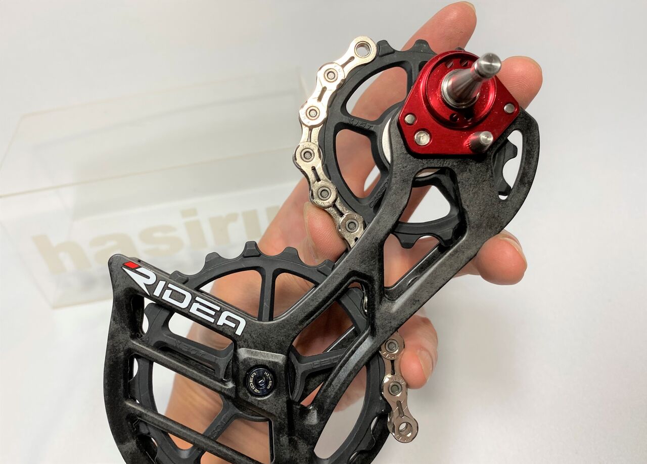 思い切って追加カットした結果、思いもよらない最高のベストセッティングが出た!フロントアウター、リヤロー〜トップ。フロントインナー、リヤロー〜トップ全て使える。結果から出た RIDEA RD5-E60FC-C セッティングデータは、チェーンは、ノーマルから3リンク(インナー、アウターリンク3ペアー)の追加。B テンションは、チェーン詰まりするギリギリまで緩めてスプロケットギヤとガイドプーリの距離を近づけ変速性能を上げる。チェーンテンションの調整は、チェーンのカットで行う。チェーンテンションの強弱による回転抵抗の増減は、結果無かった事も記しておこう。各シフトによる RD の角度を撮影しておいた。