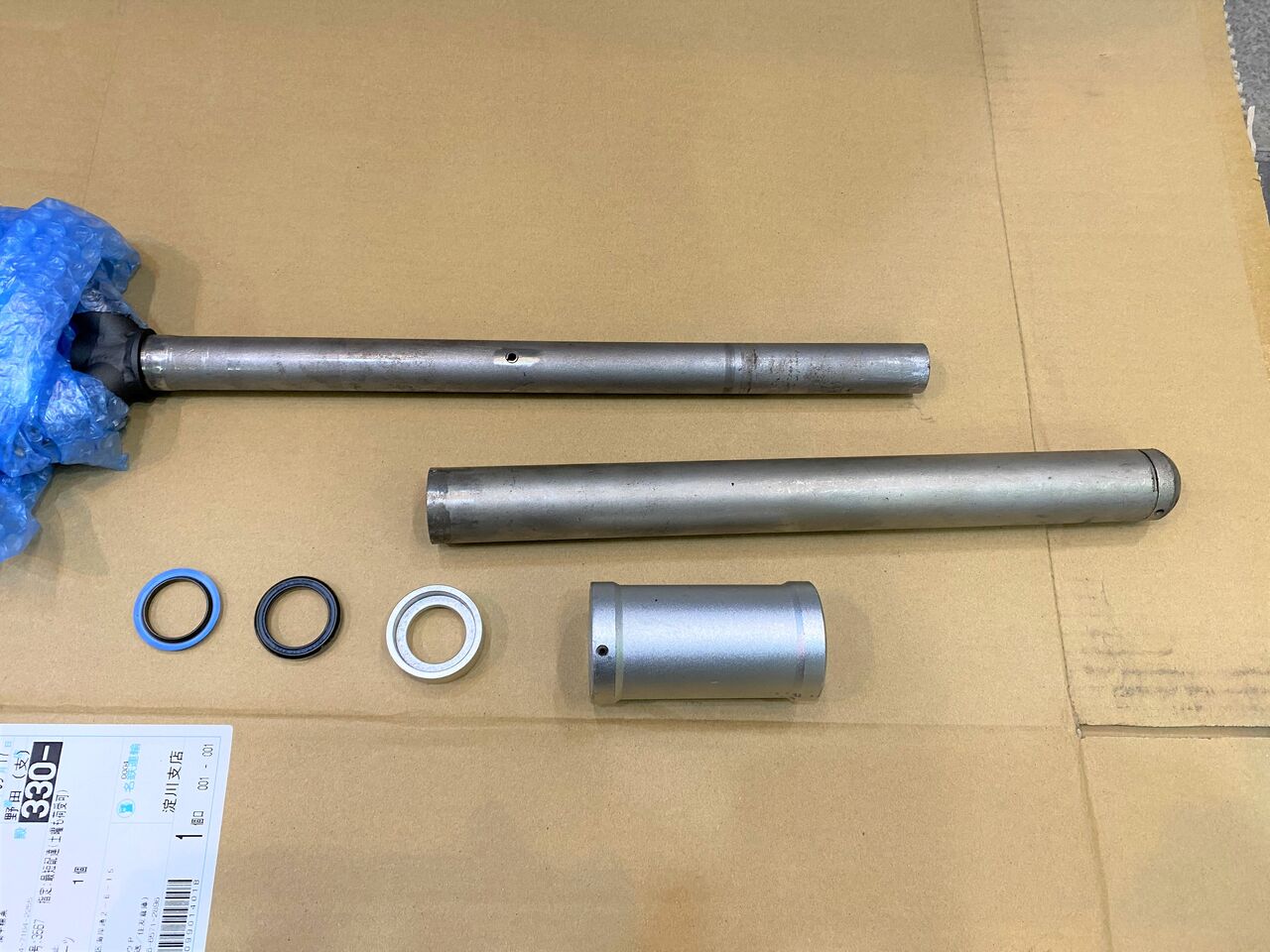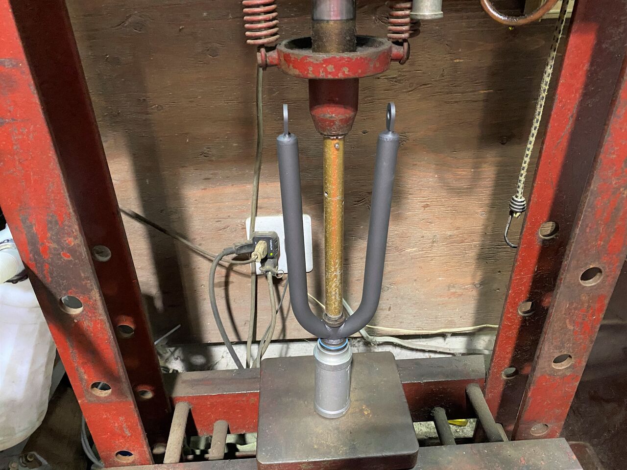 そこで油圧プレスを拝借。ところがプレスフレームよりフォークの方が長く、色々と試した結果アップサイドダウンのこの方法で何とか。