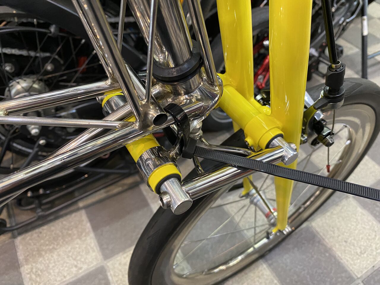 ハンドルが切れないようにタイラップでがんじがらめにしました。クランクも同様クランプしました。