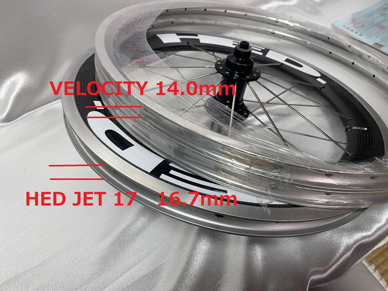リム内々の幅を測ってみると上の VELOCITY が14.0mm で HED JET 17 が16.7mm と2.7mm もの違いがある。これだ!