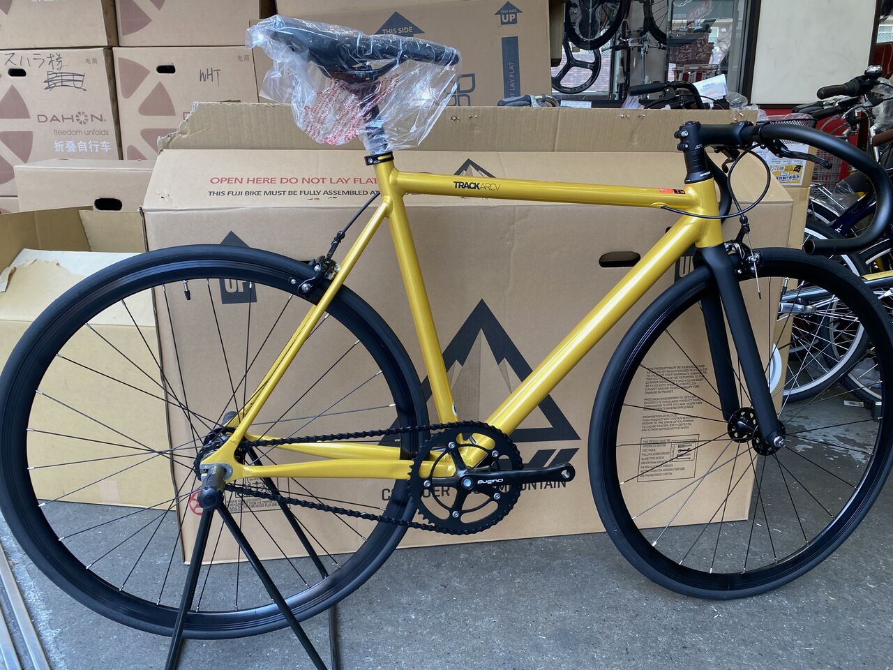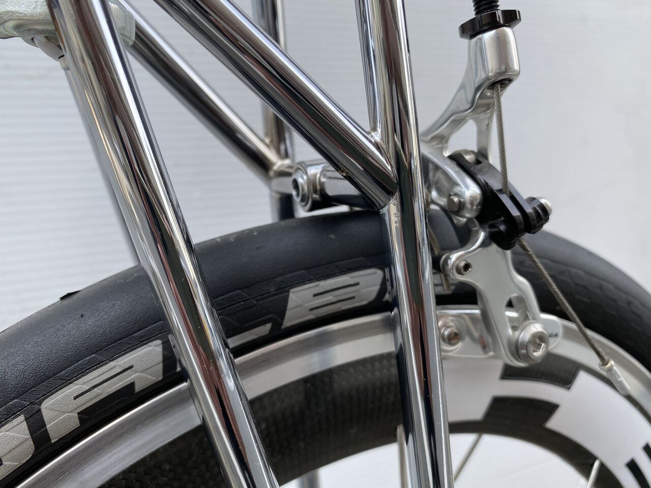 確かにギリギリの設計ではあるが、17インチの HR を作る際、木森さんにコジャックを組んだ HED JET 17 ホイールセットとブレーキキャリパーを送っている。その後2号機3号機等で DURA や ULTEGRA などのブレーキを組んだが問題はなかった。