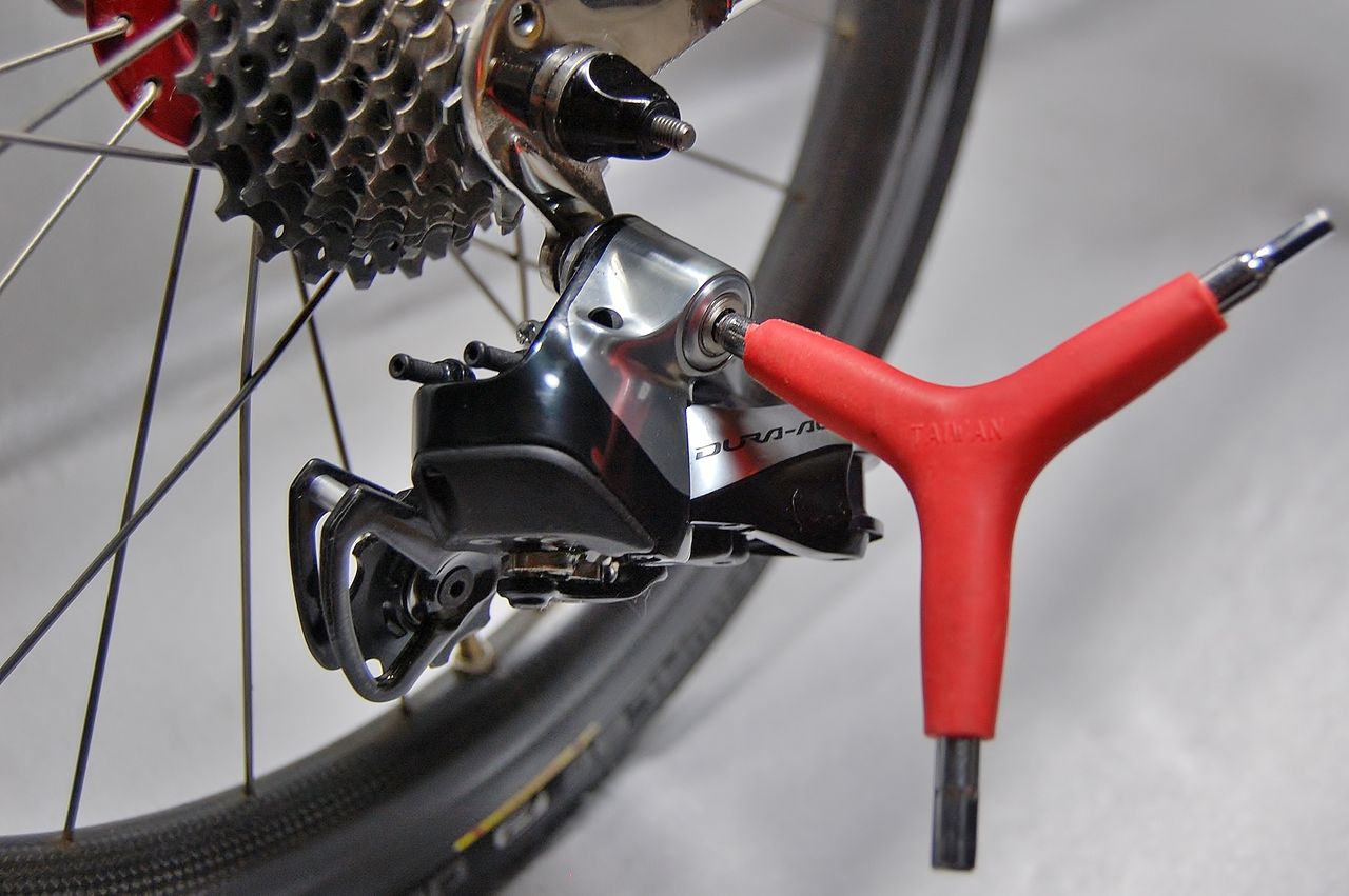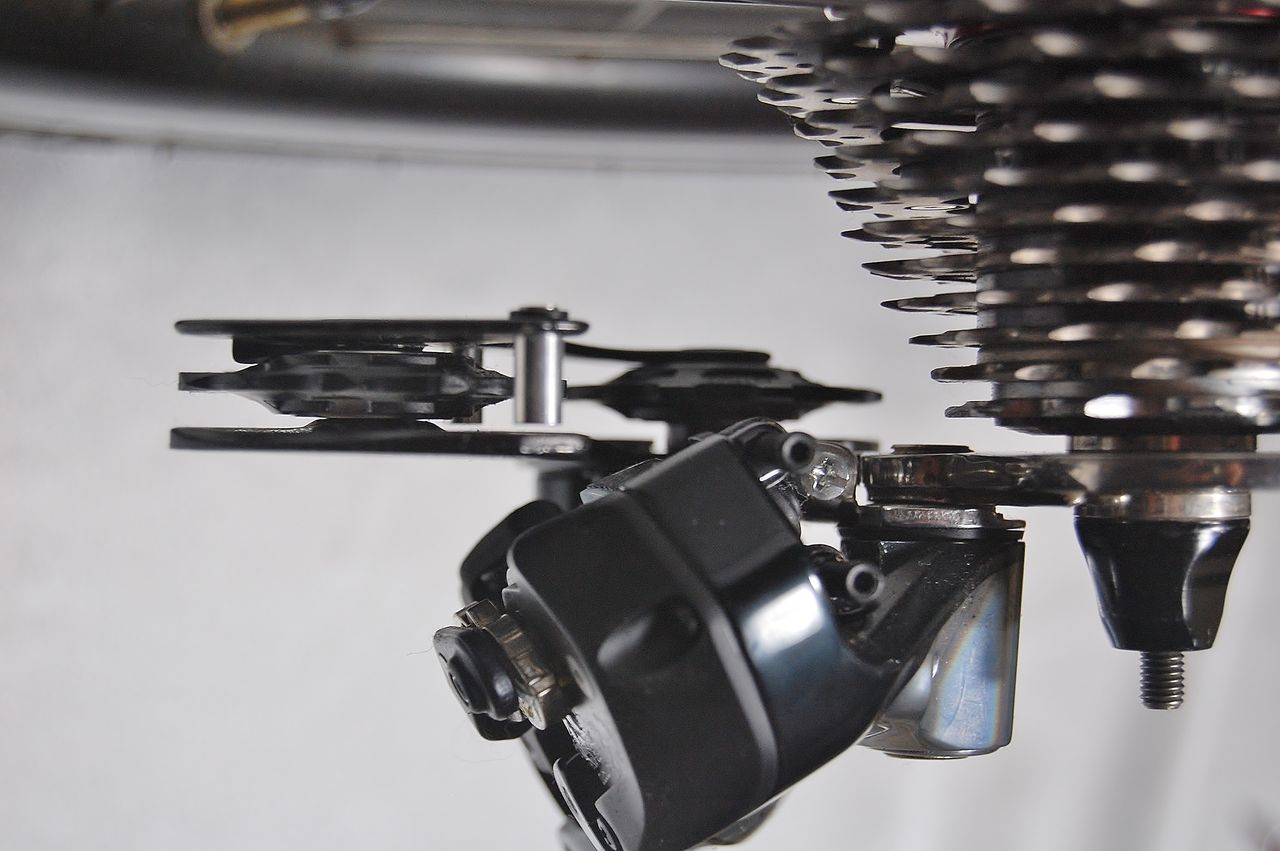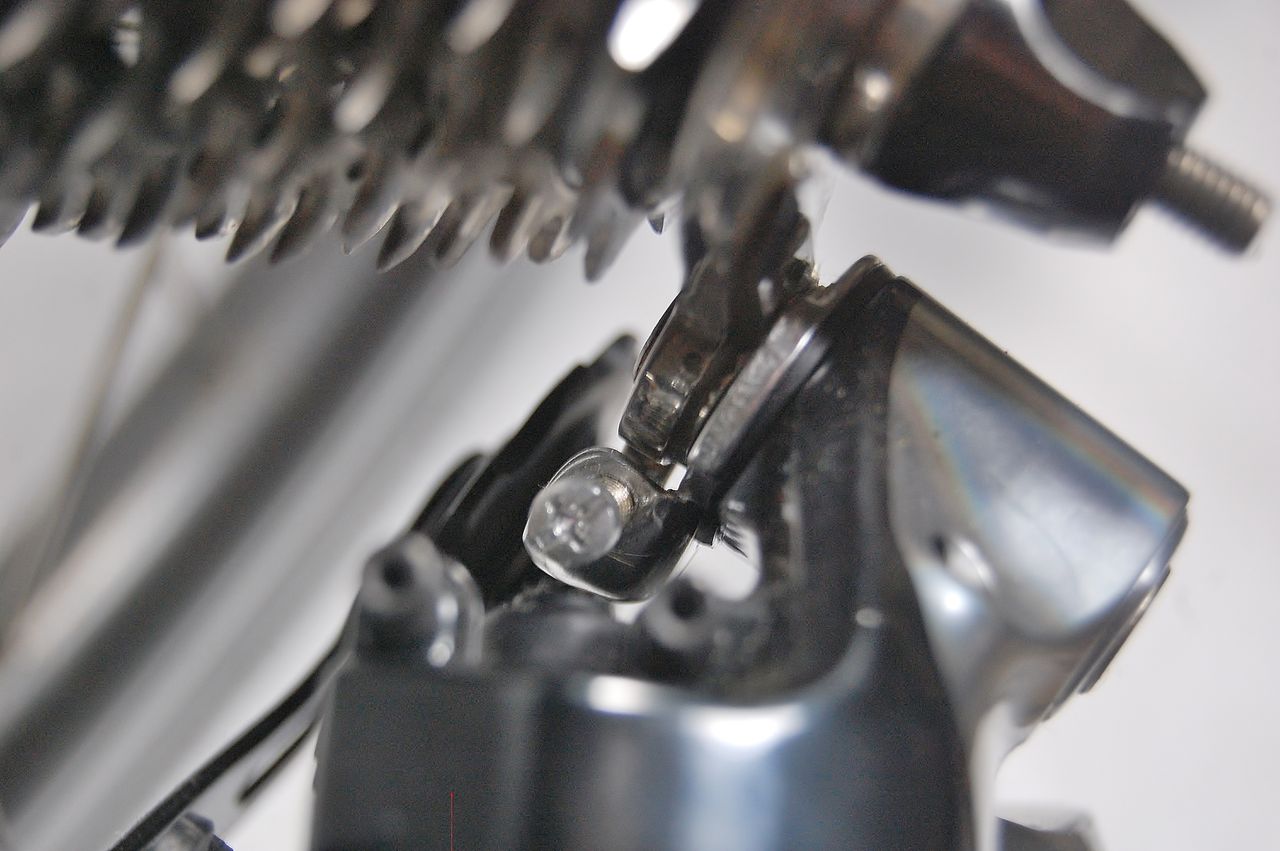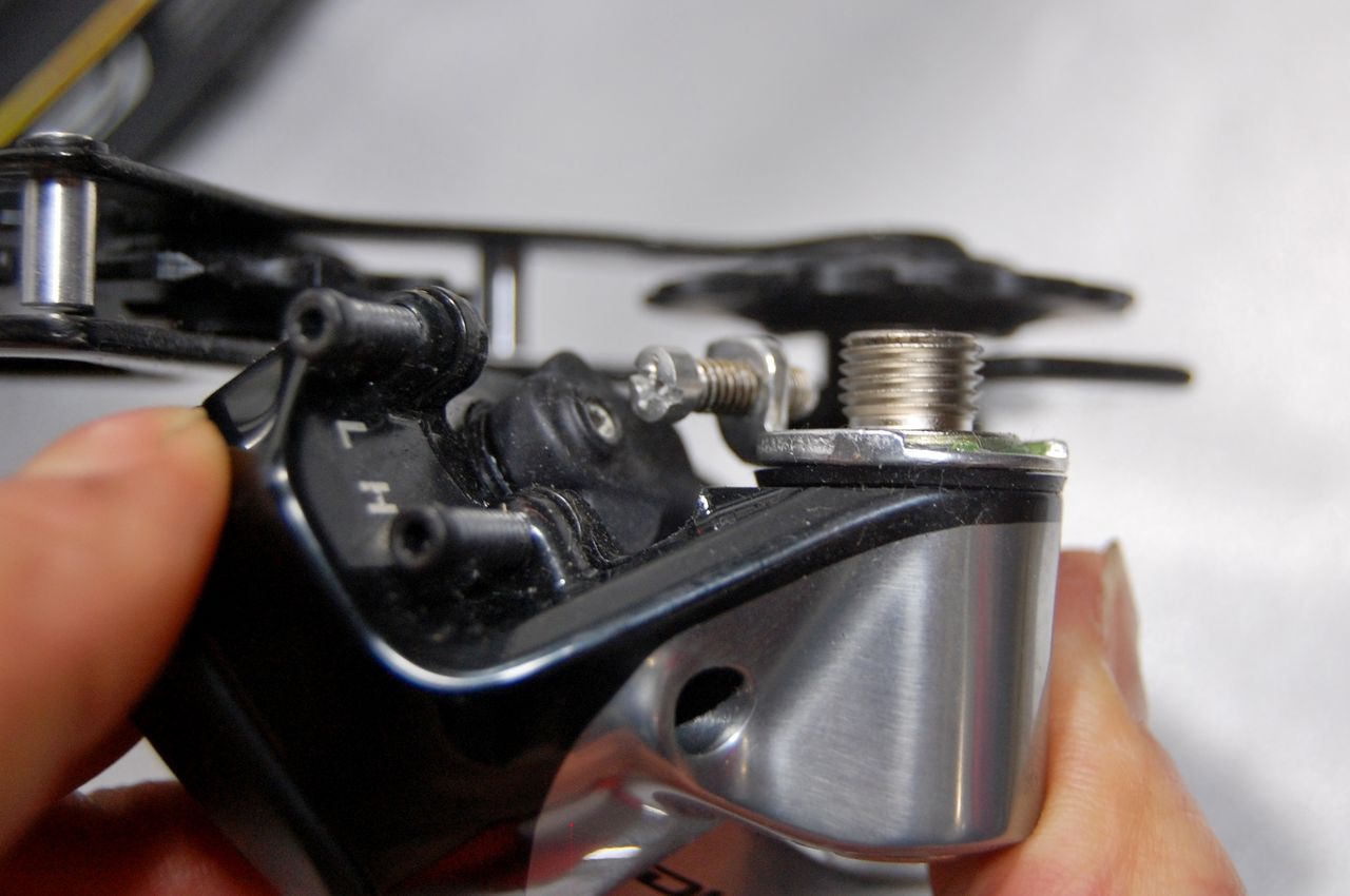 左が Hi で右が Lo のアジャストスクリュー。その右上が、エンドアジャストボルト(Bテンションではない)。ワイヤーアジャスターも新しいタイプ。