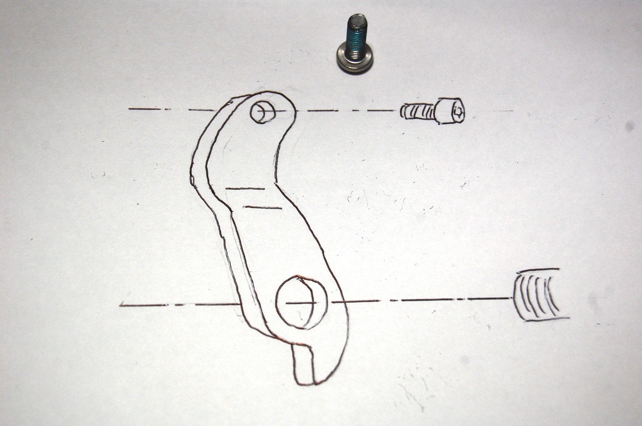 ケーブルは、黄色の線を辿って固定されキャップの穴を潜り後方(写真の場合は、左)に逃げる。もうエンドキャップが足にぴんぴん跳ねることはない。更に画期的なのが、ワイヤー受けを通ってくるので、フレームの形状に全く左右されないフロントディレーラーとなったこと。とんでもない所にアウター受けを付けているアレックス・モールトンには持って来いだ。(赤のようなラインになっても フロントディレーラーを動かす力には影響がない)