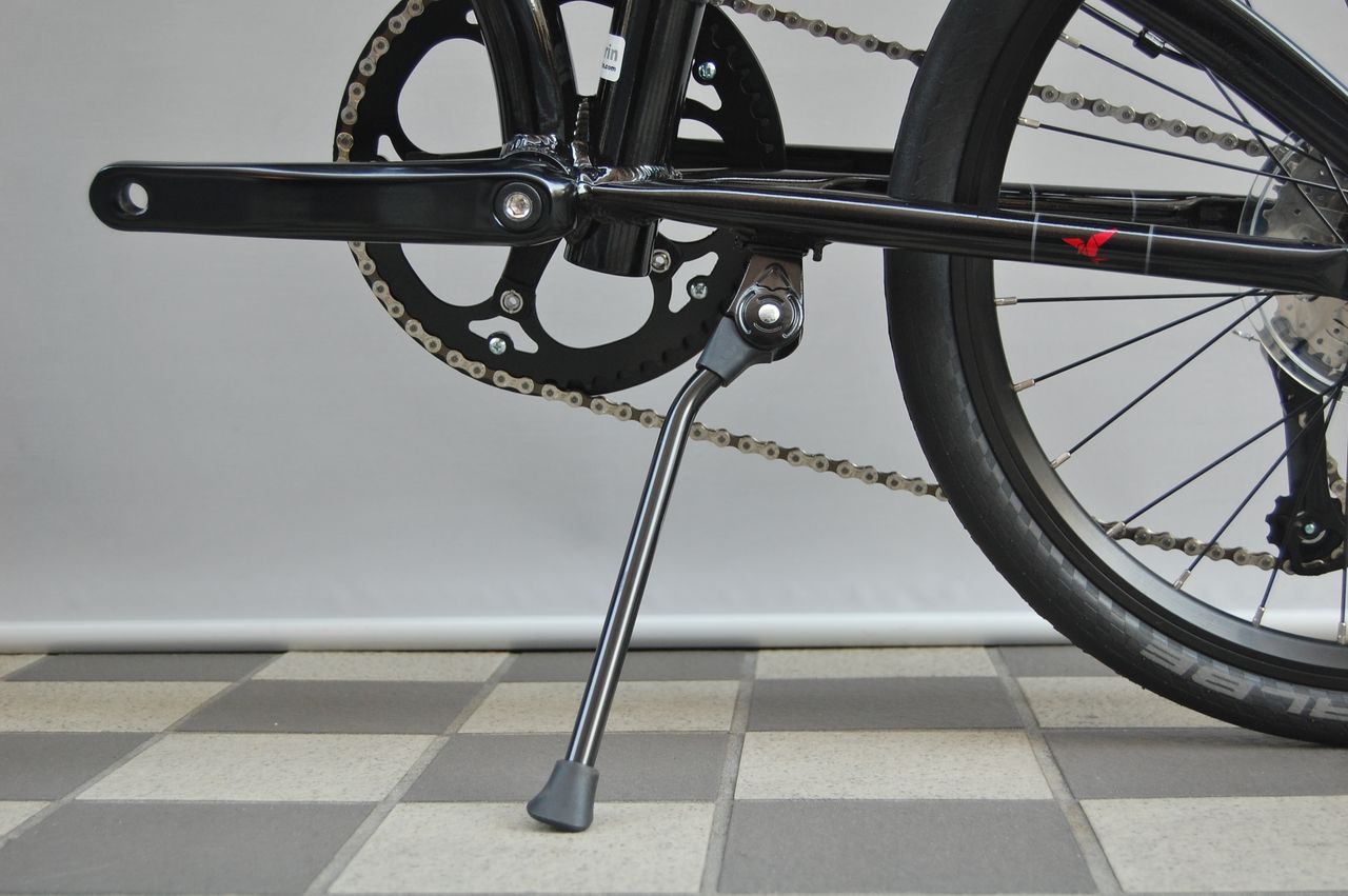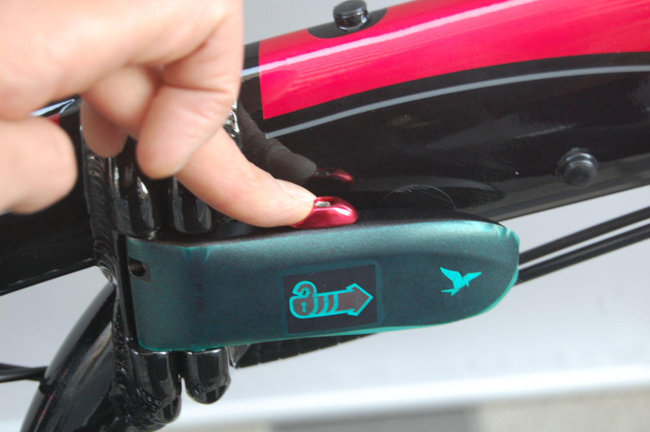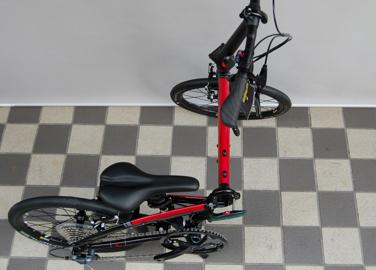 ここポイント。左に180°ハンドルを切ってこの状態に。(ここがDAHON との違い)進行方向に反っていたフロントフォークをひっくり返すことで全長が短くなります。