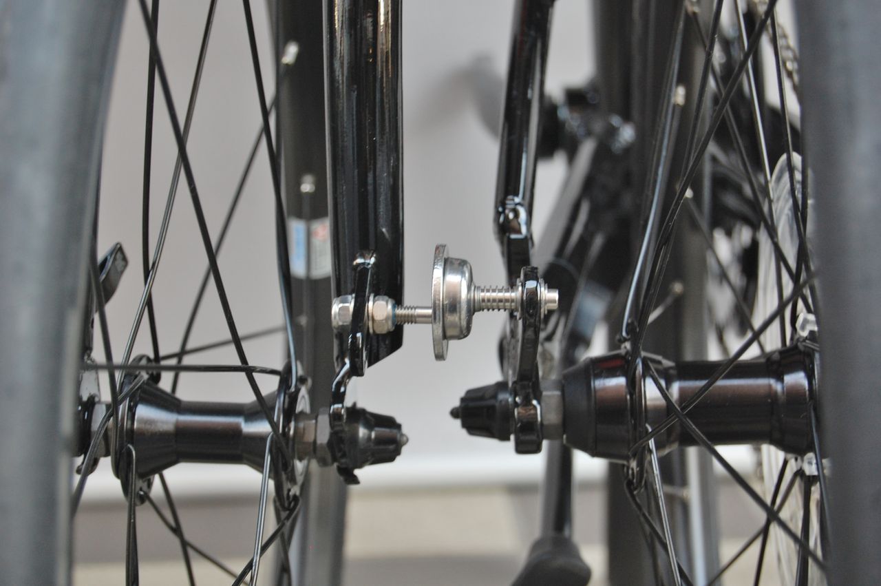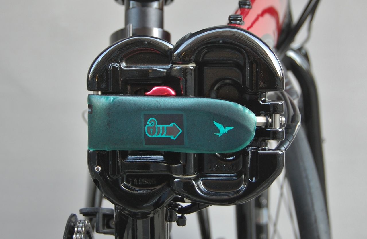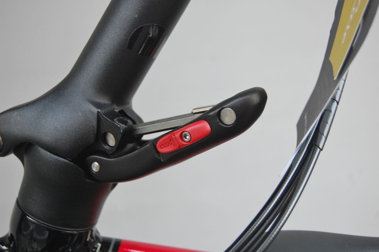 ここポイント。左に180°ハンドルを切ってこの状態に。(ここがDAHON との違い)進行方向に反っていたフロントフォークをひっくり返すことで全長が短くなります。